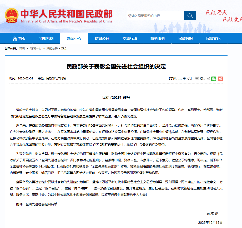 2月2日,民政部官网发布公告,在第五次“全国先进社会组织”评比表彰活动中,台州市创业服务协会获评“全国先进社会组织”,浙江省仅8个组织获评,为台州唯一。