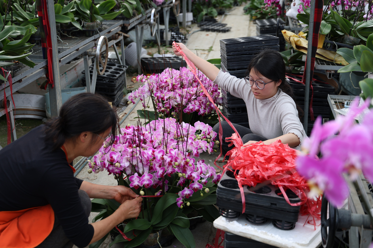 与盛放的鲜花相映的,是繁忙的产销景象。工人们分工明确、有条不紊,忙着对蝴蝶兰进行分拣、套盆、打包,将一朵朵盛放的鲜花整理成束,全力确保每一株花卉都以最佳状态送达消费者手中。不少市民专程驱车前来选购,仔细挑选心仪的蝴蝶兰,只为给即将到来的马年新春添彩头、增喜庆,把浓浓的年味与美好的祝福一同带回家。