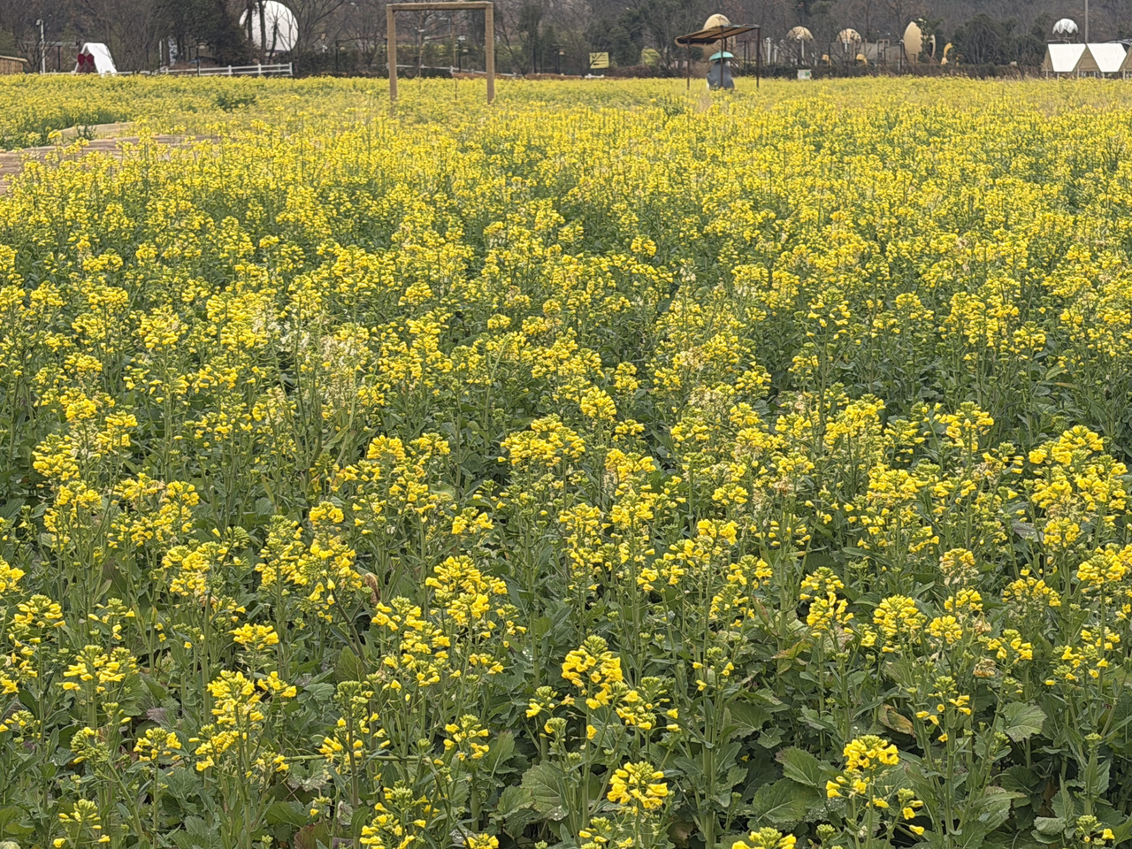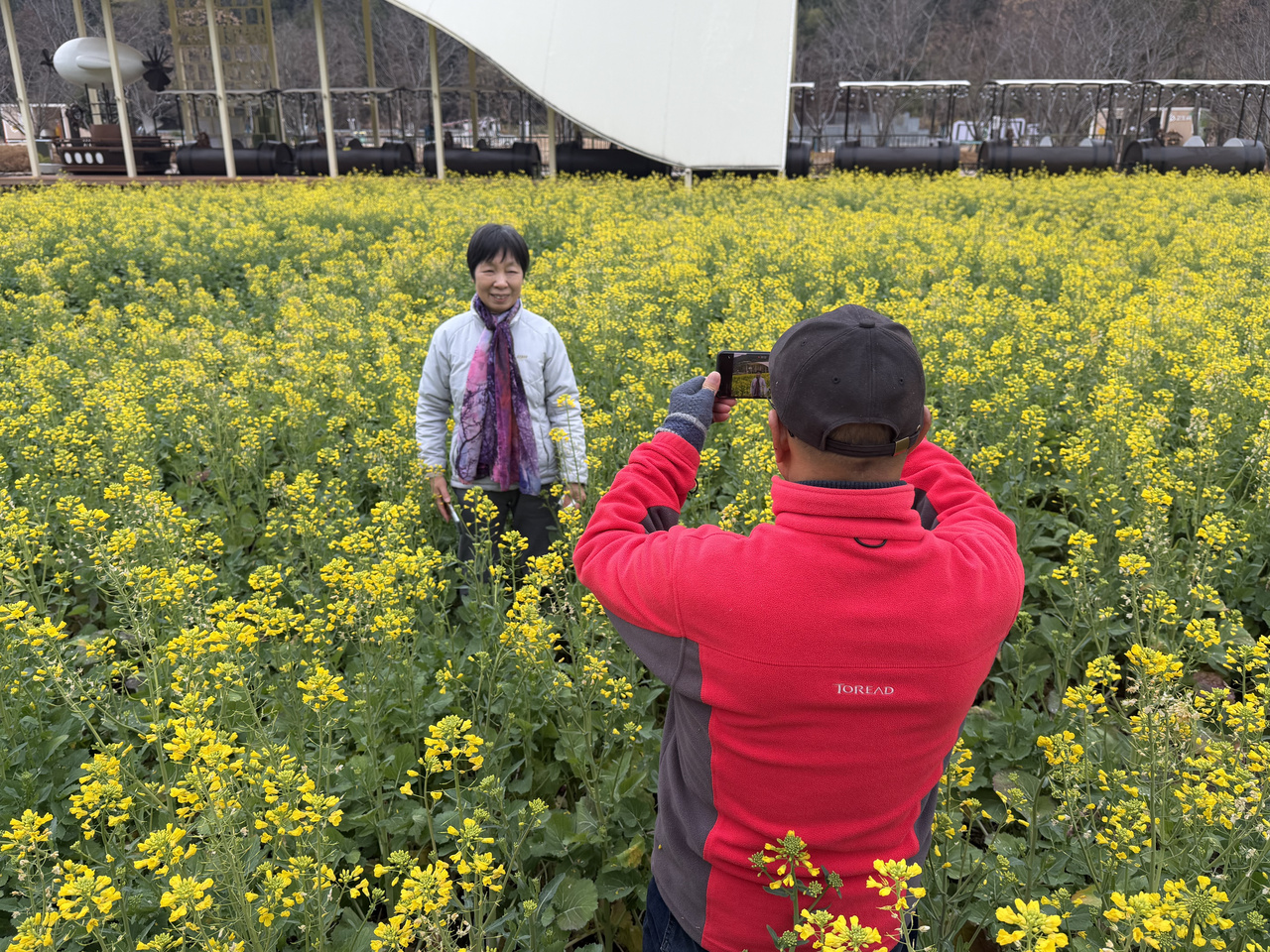 这片油菜花是当地引进的早熟品种“迎春一号”,由省农科院培育,本地种粮大户种植,台州市农科院技术人员提供技术支持。作为春性品种,它无需低温春化就能开花,2025年9月播种,2026年元旦前后盛放。该品种花期比普通油菜花更长,可持续3个多月,具有显著的错时观赏价值。