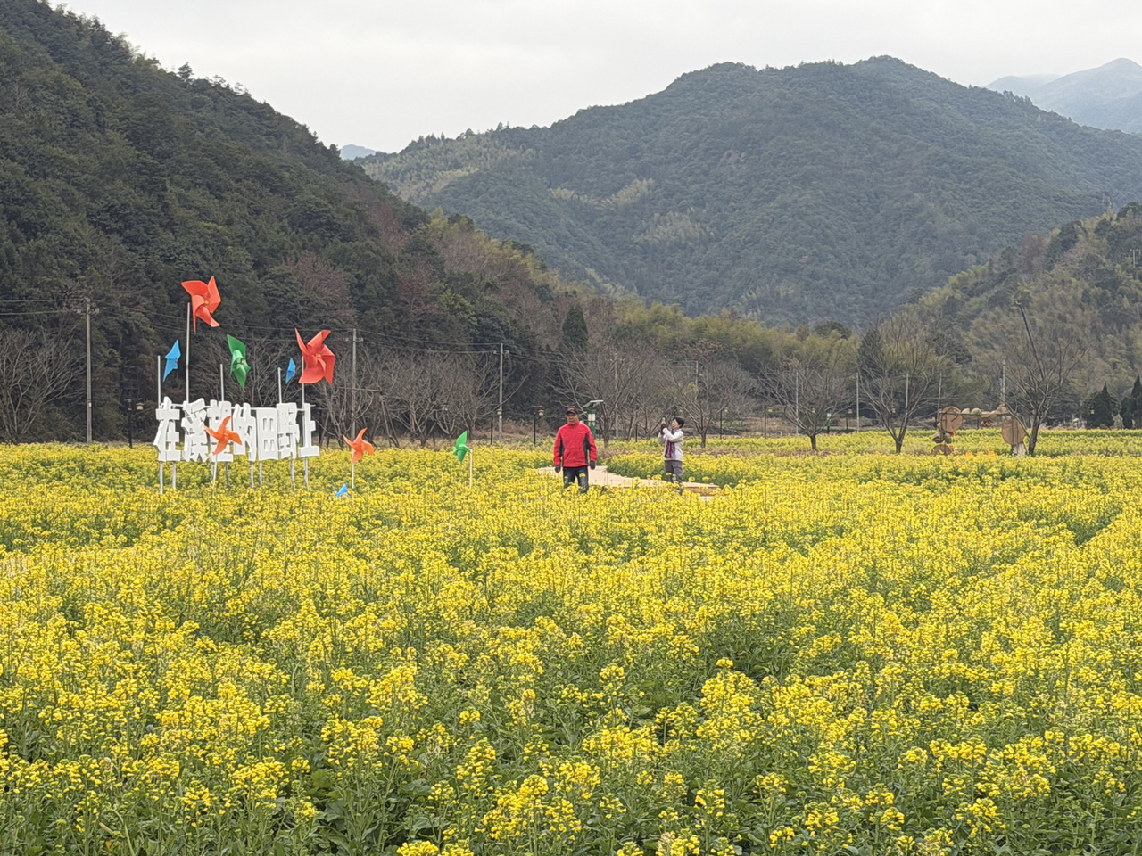 在临海市江南·溪望谷景区,100多亩油菜花灿然盛开,金色花海沿着游步道铺向远方,与黛色青山、潺潺溪流构成一幅天然画卷,吸引了不少本地市民和外地游客前来打卡。