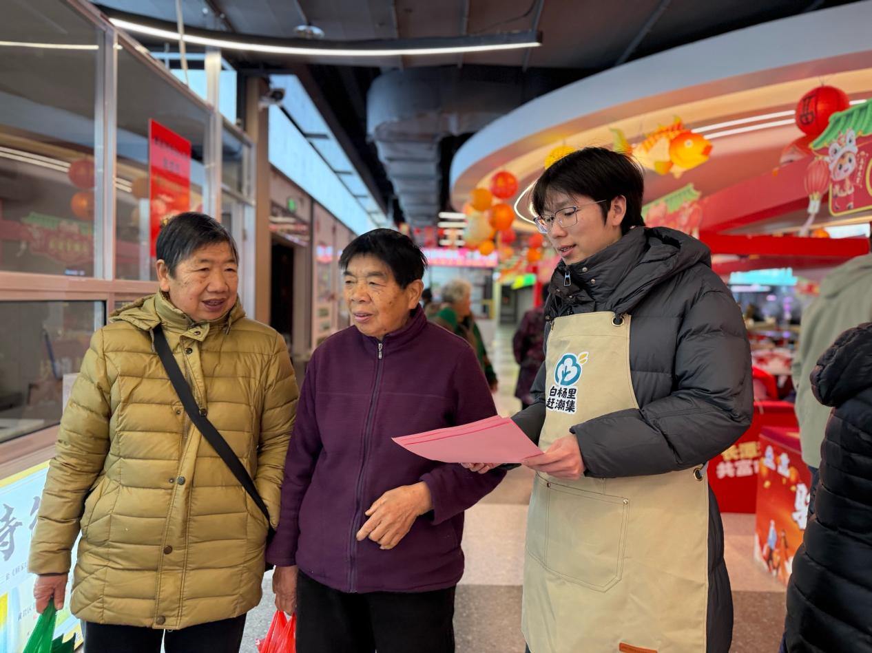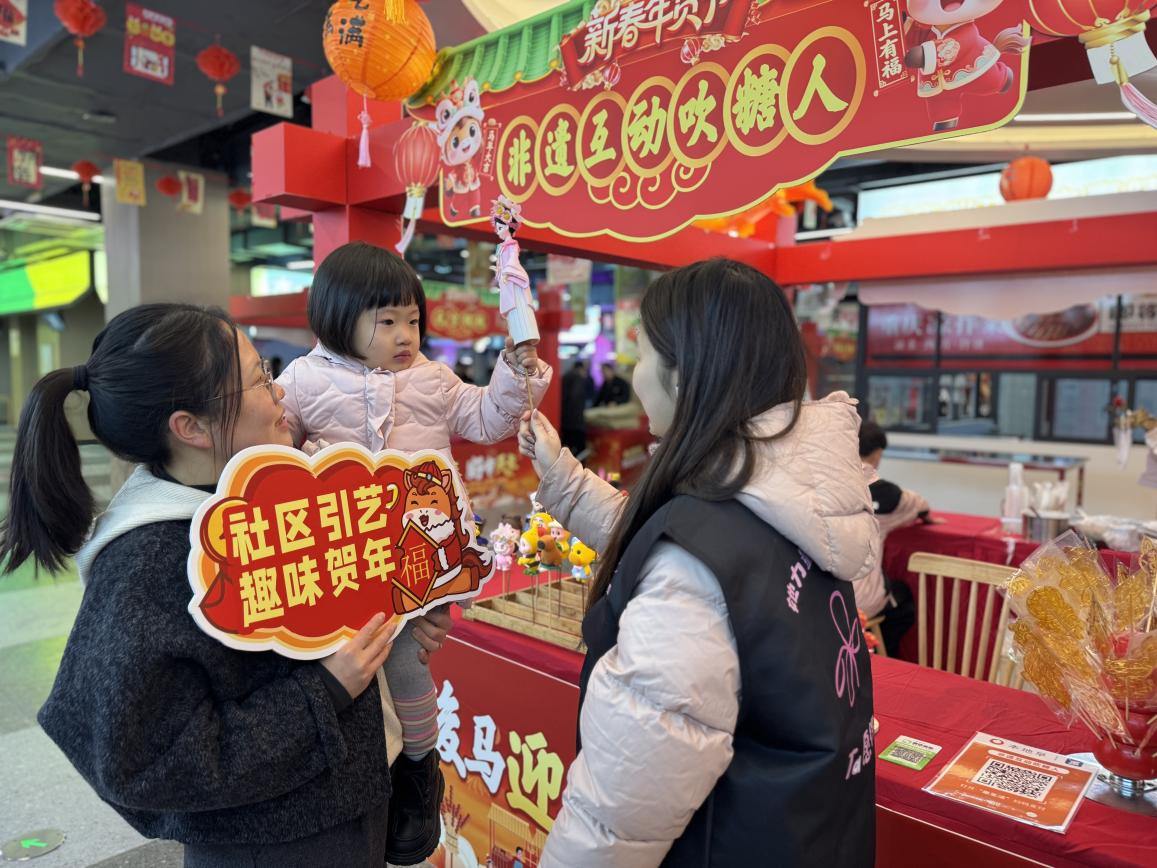 市集另一侧,“白杨里·赶潮集”农产品摊位前,新鲜果蔬、本土腊味整齐码放,特蔬菜摊菜前更是排起了长队。“白杨潮”志愿者们穿梭在人群中,既积极协助商户对接资源、解决经营难题,也向居民发放禁燃倡议书,耐心讲解黄岩区禁燃限放规定及烟花爆竹危害,倡导绿色文明过佳节。而山亭社区“亭好啊老伙计”志愿服务队的 “囤年货・品非遗”专区,堪称市集里的“人气王”——代表性非遗吹糖人手艺师傅手持糖稀,手腕灵活转动,短短几十秒,一只栩栩如生的骏马糖人就成型了。“太神奇了!我小时候也吃过这个,没想到现在还能看到!” 居民李阿姨带着女儿驻足观看,忍不住回忆起儿时时光。师傅笑着回应““能让孩子们了解老手艺,把非遗传承下去,比啥都强!