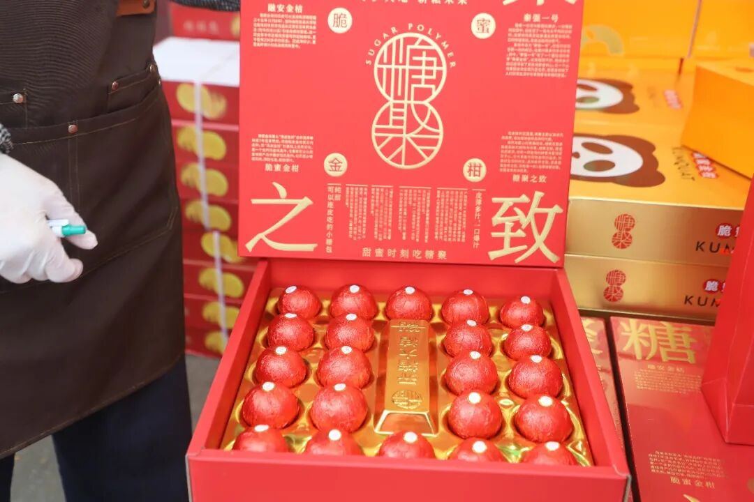 市场里,不少果品都换上了精致的节日包装。记者在一处摊位前看到,工作人员正忙着卸载一批金柑礼盒。店家随手打开一盒,只见这款金柑果型远大于本地品种,且每一颗都做了独立包装,精致感十足。摊位商家向记者介绍,这款金柑礼盒单价170元,是近期市场上的热销爆款,每天都能卖出数十盒。