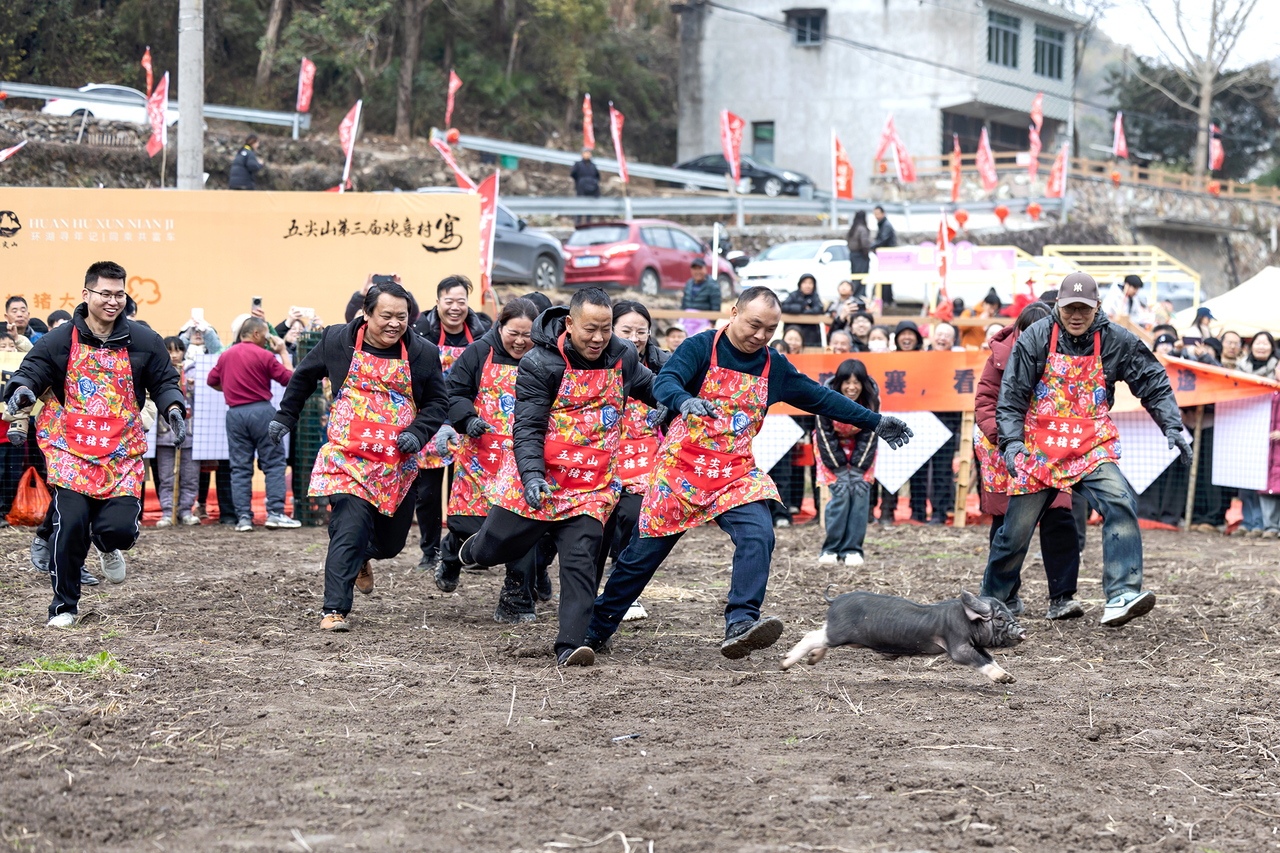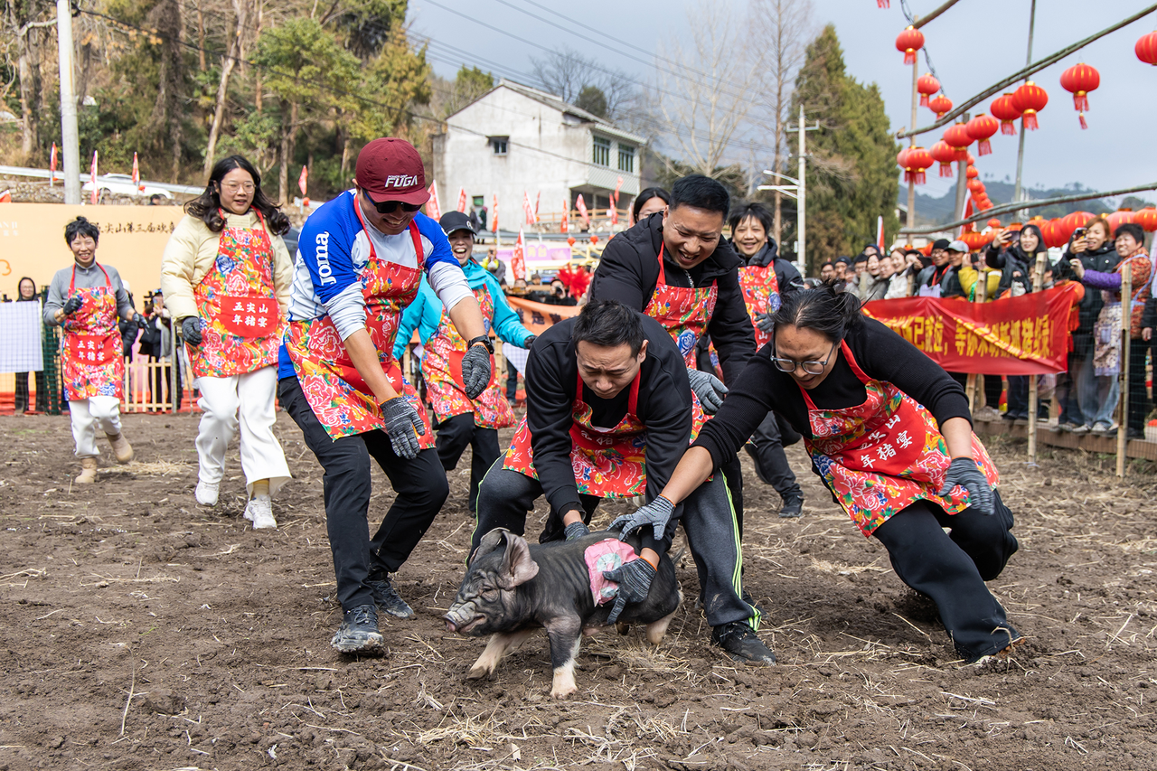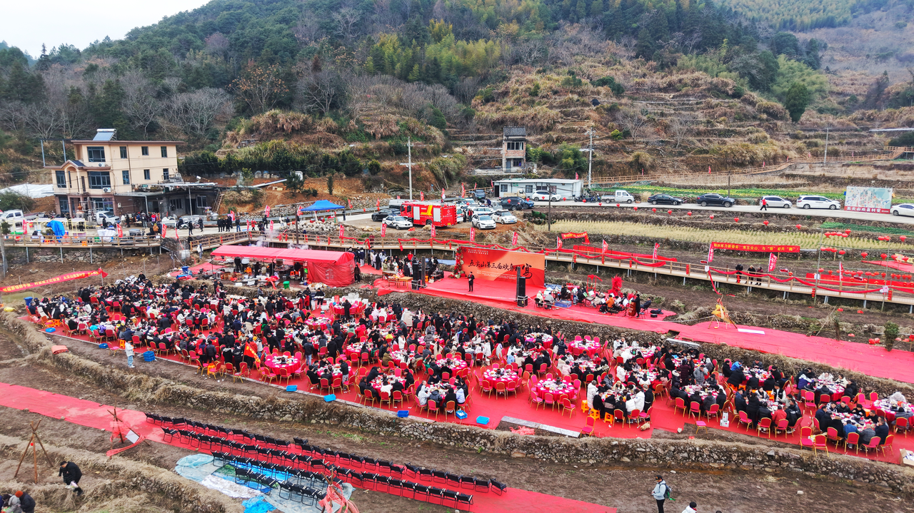 2月7日至2月8日,在黄岩区北洋镇海拔800米的五尖山村,一场欢喜村宴热闹开席!这是五尖山村连续三年举办该项活动。为期两天的节庆活动,99桌“欢喜村宴”座无虚席,传统村宴融入抓猪趣味竞赛、手作体验、山野市集等十大“猪”事活动,吸引了5000余名游客上山追寻记忆中的年味,为村集体带来超15万元的增收。这场高山上的热闹聚会,是北洋镇探索“大镇带小乡”组团发展模式,以文旅融合撬动片区共富的生动实践。