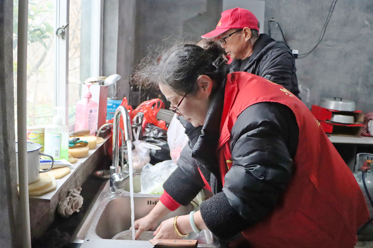 在现场,身着红马甲的志愿者们里里外外忙活起来。临近春节了,民间都有掸蓬壅的风俗。知道二老行动不便,志愿者们都自带了打扫工具。大家先是拆洗窗帘,再是清洗大门玻璃,再是打扫地面,帮着清理房间里的杂物。