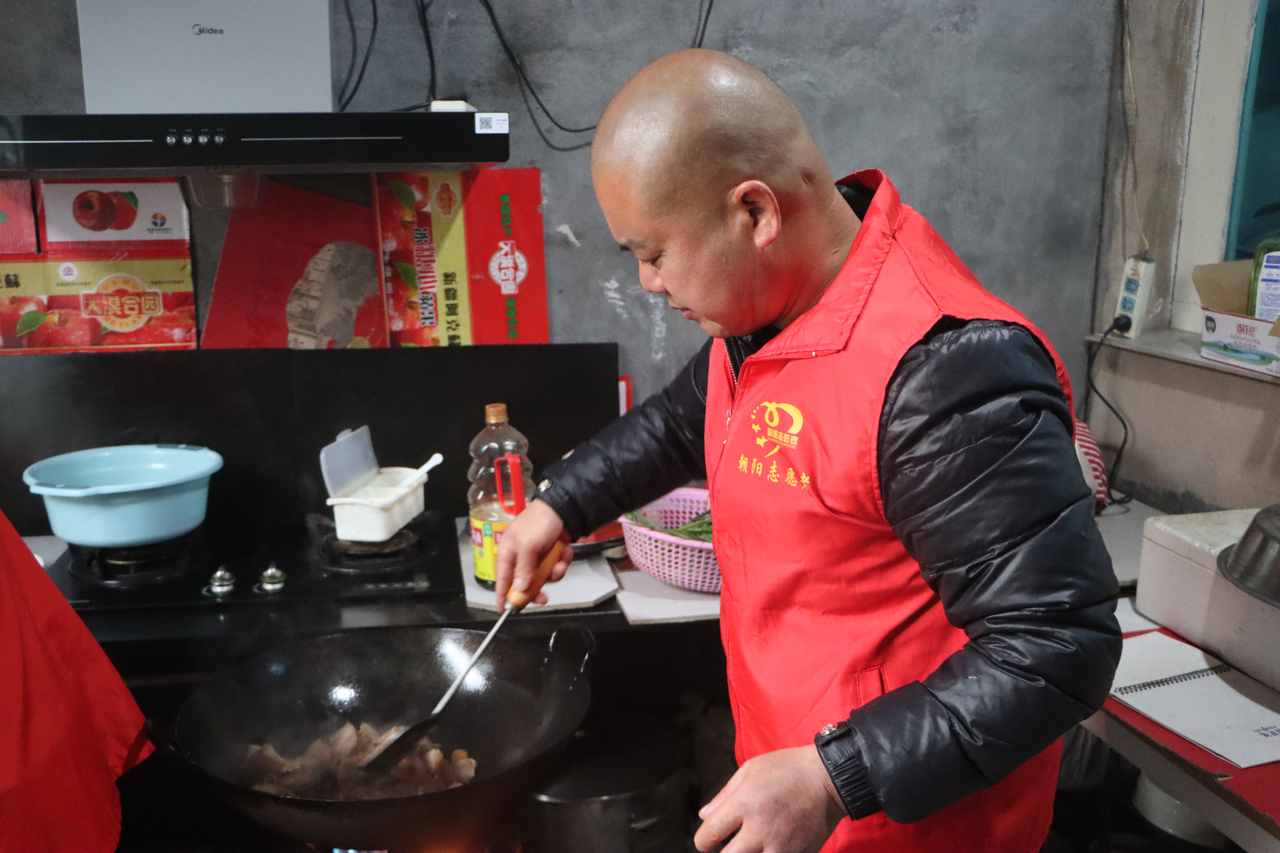 与这边相比,厨房里也是非常热闹的。志愿者们有的做帮厨,从洗盘到洗菜再到配料准备,有的则当起主厨,一勺在锅里翻滚,料酒等佐料依次入锅,烟雾腾腾之间,竟是一片热闹的团圆味。