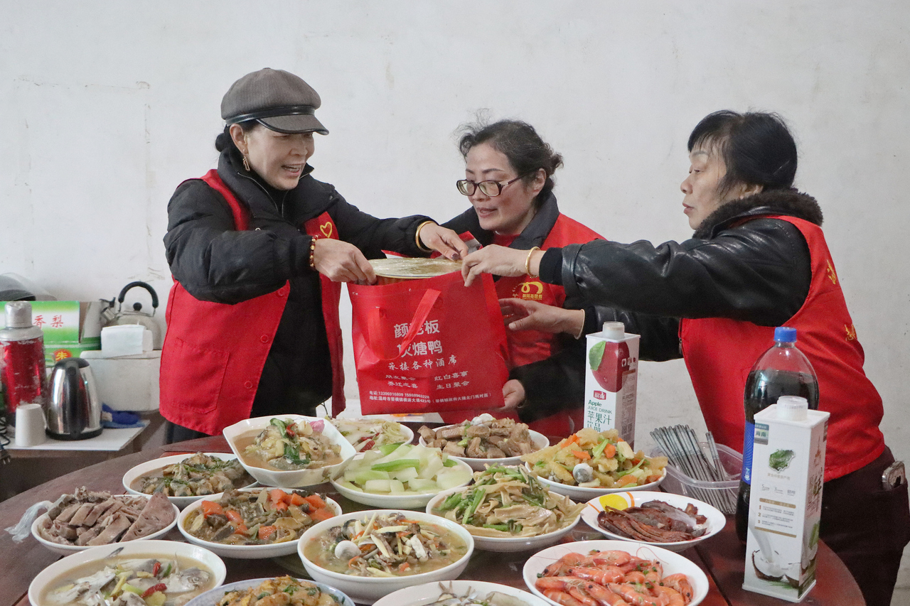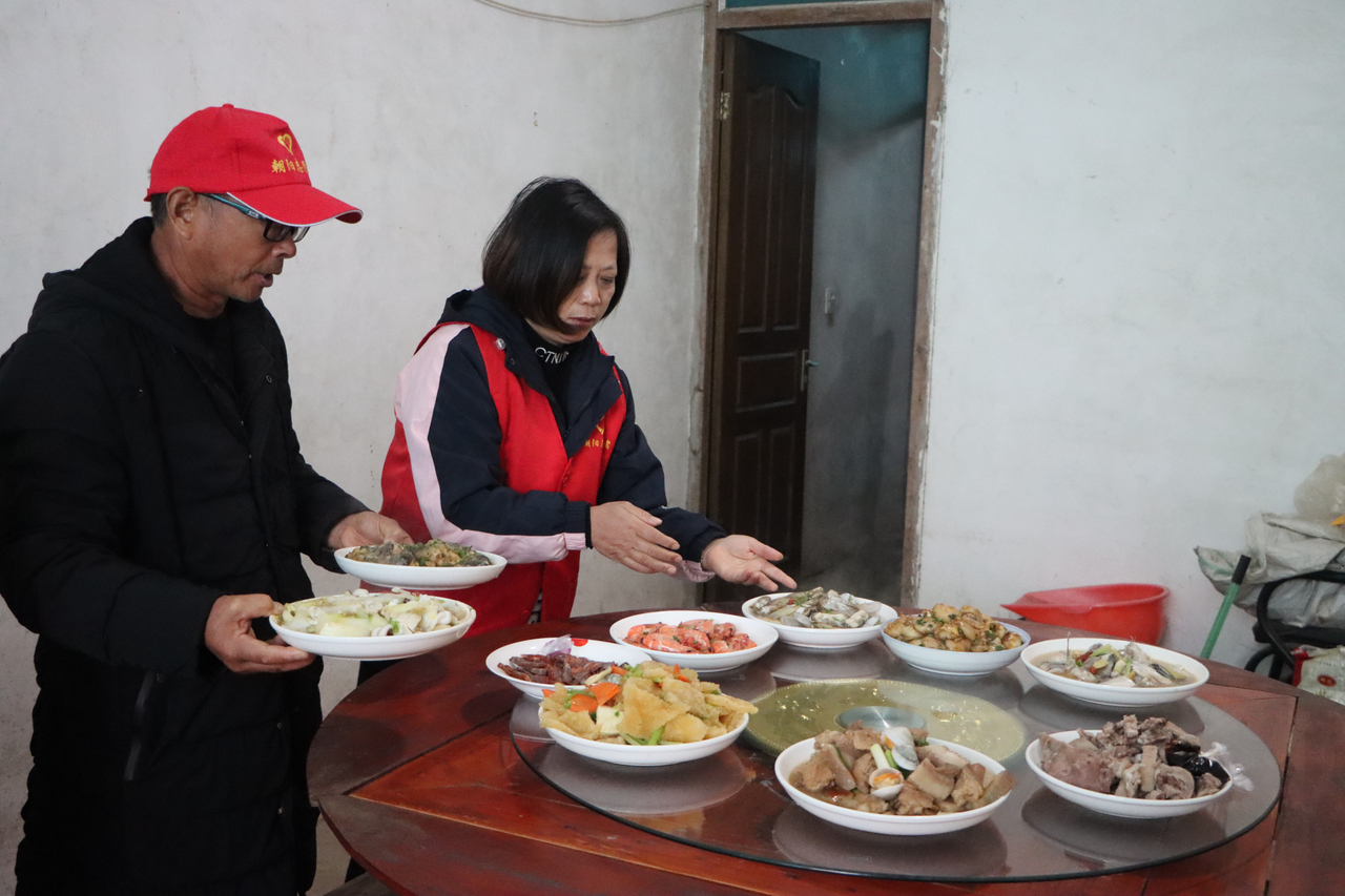 当天在江大爷家,一大桌的“爱心年夜饭”在温岭市朝阳志愿者服务队的操持下快速做成。餐桌上,鸭煲,清蒸黄鱼、鲳鱼,红烧鳖、勾芡海参……琳琅满目、色香味俱全。