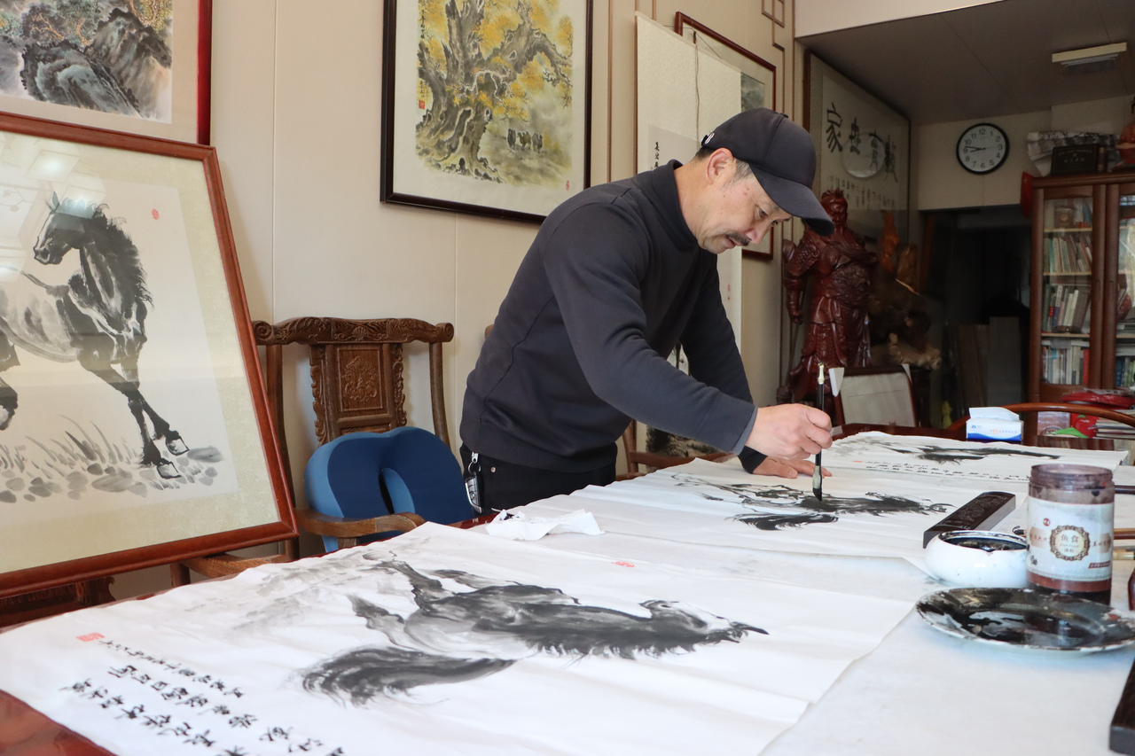 走进若苒轩,满屋子的马儿的画作与雕作迎面而来。这是一片草原上的马场,更是一位木雕工匠、“草根画家”心中的自由天地。马若琦表示,只要村民群众有需要,他的家永远都是大家的公共文化空间。至于他的马儿,也如是——无论是二维的水墨画还是三维的木雕作品,也都能搬到大家的家中。