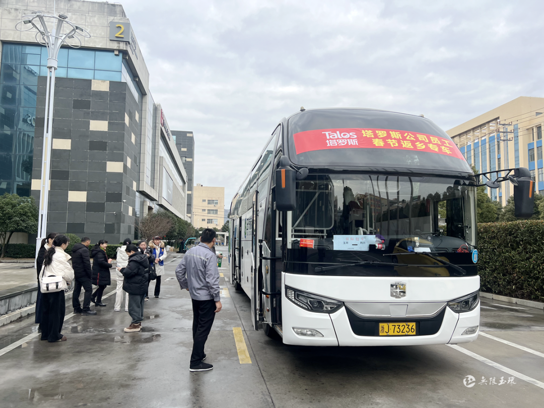 2月10日清晨7时许,寒风中透着暖意。在塔罗斯科技股份有限公司门口,一辆印有“塔罗斯员工春节返乡专车”醒目字样的大巴车整装待发,即将启程前往千里之外的湖北。员工们提着大包小包的年货行李,脸上洋溢着回家的喜悦,有序登车。