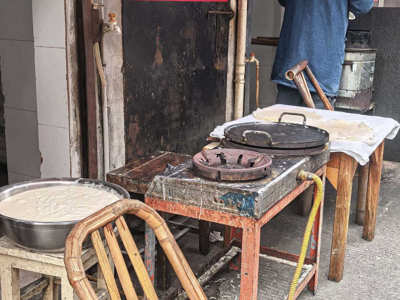 食饼皮好不好,主要看面糊。做了16年食饼皮,王琴芳有自己的独门配方。十斤左右的小麦粉,加适量的盐,最后加水,搅拌均匀后静置数小时。“这种面糊做出的食饼皮才够韧,不容易破,香气还足。”