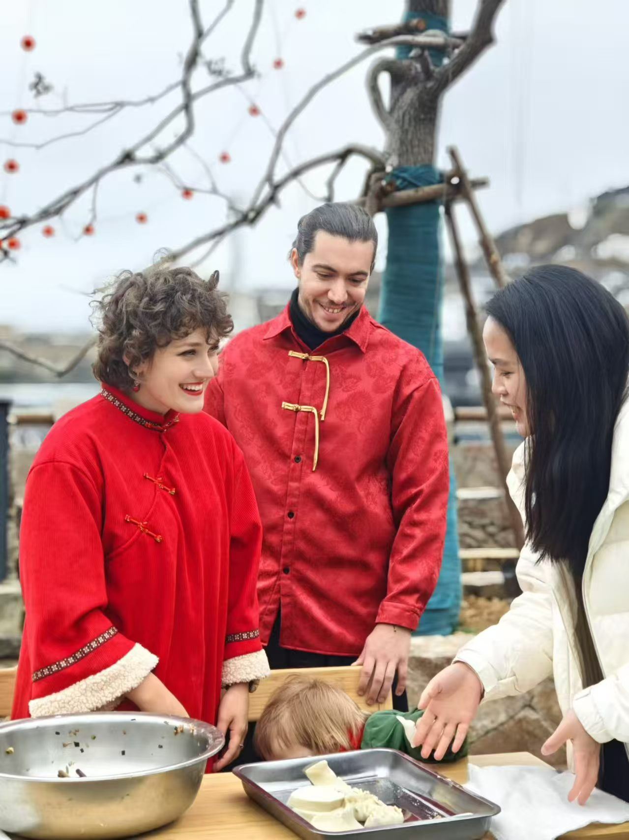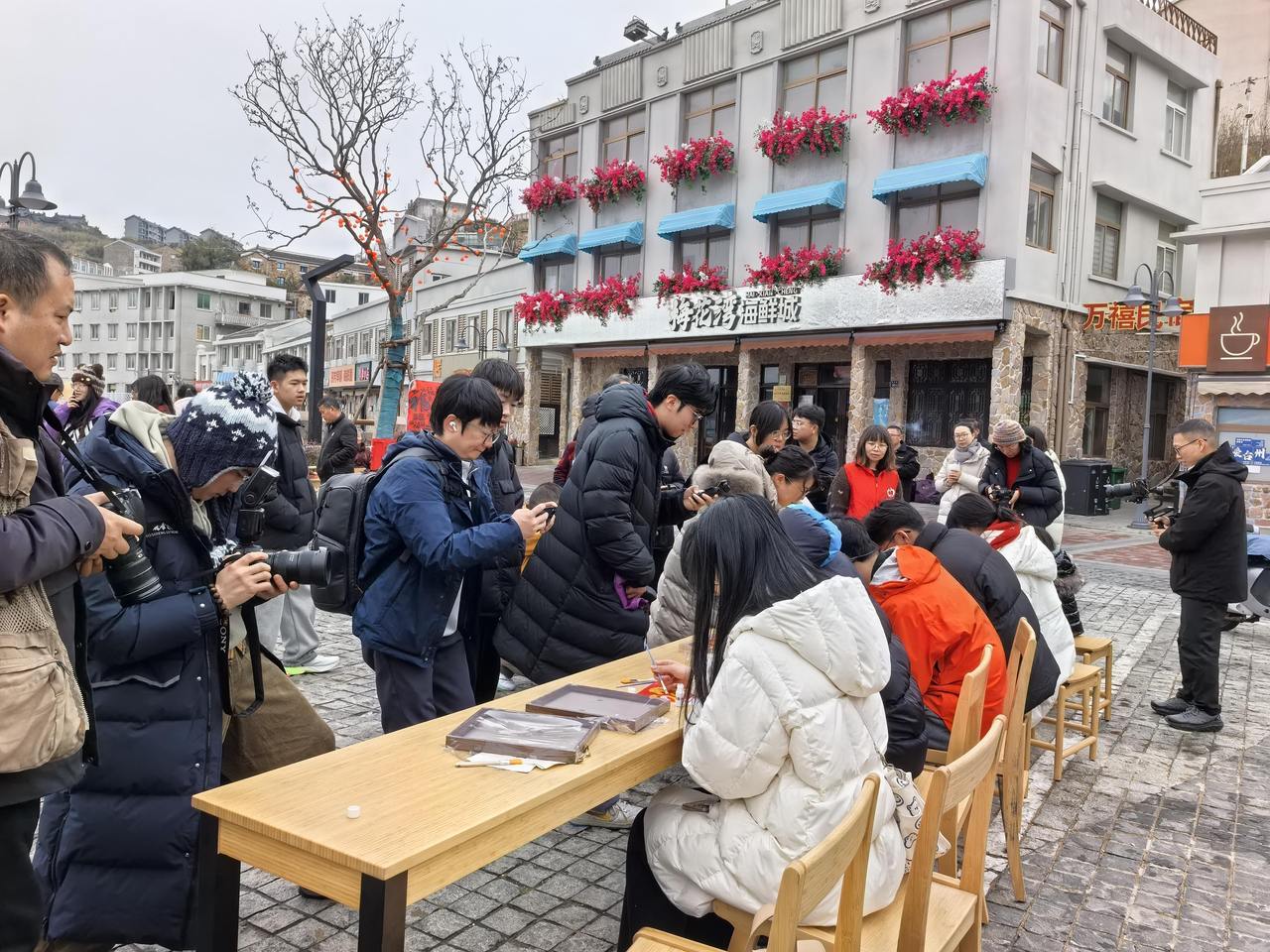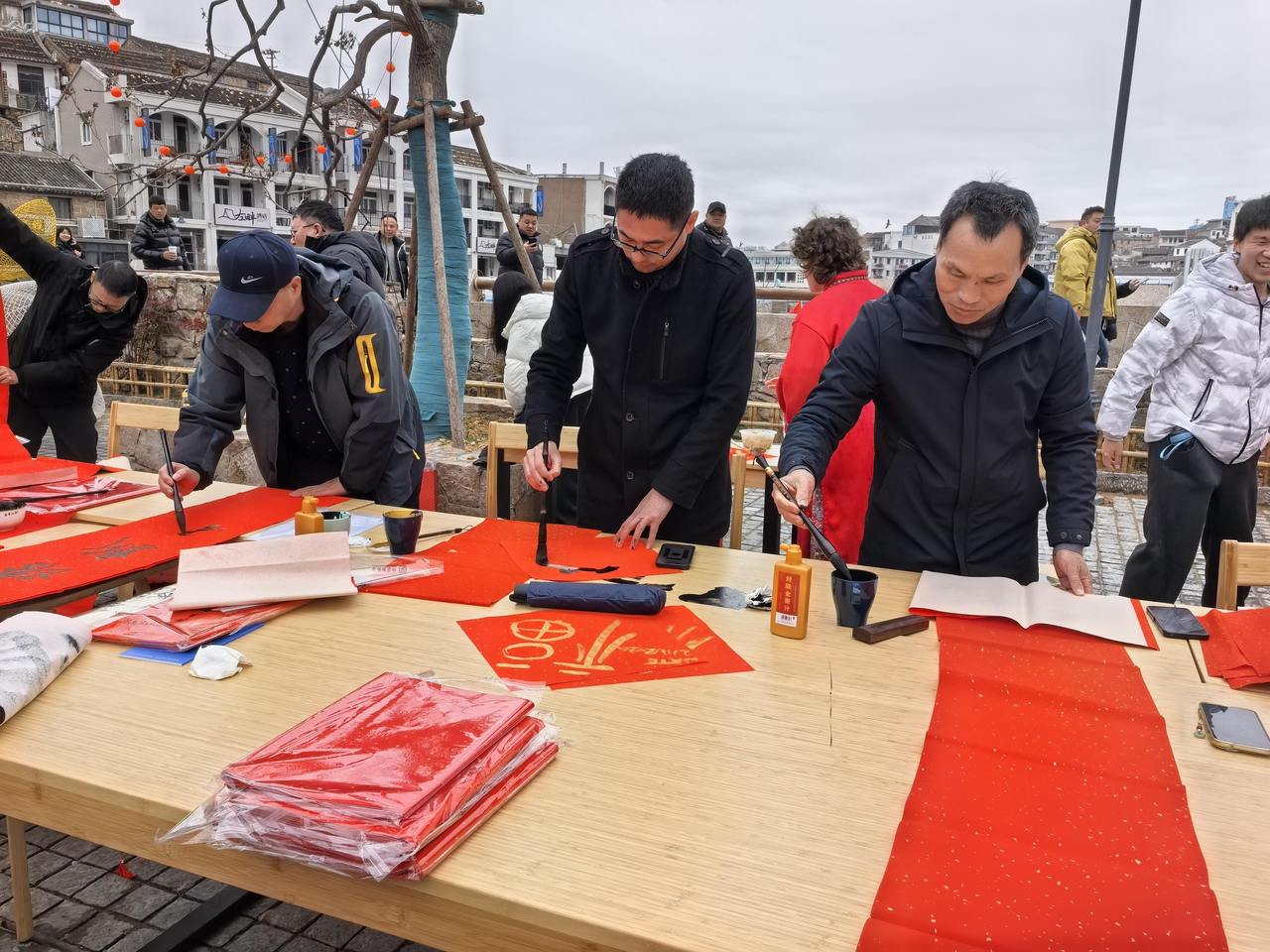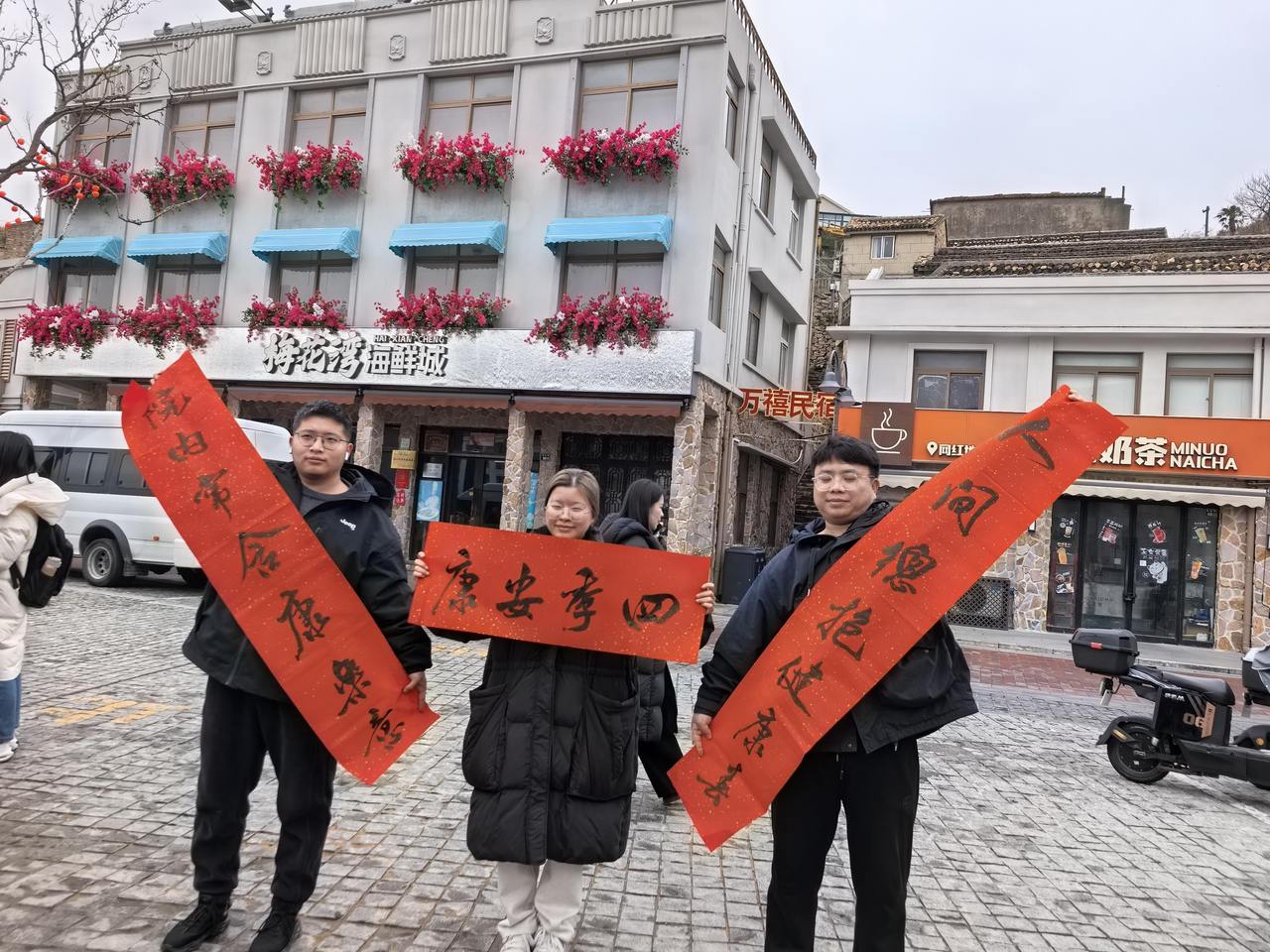 “马到成功圈福来”趣味游戏人气高涨,30余名来自清华大学、浙江大学的在岛社会实践学生纷纷圈得属于自己的“海岛白菜”,现场欢笑声此起彼伏。一旁写春联、画福字区域墨香四溢,书法家们挥毫创作马年吉祥楹联,来自塞尔维亚的Nate、Poppy一家三口也兴致勃勃参与其中,体验书写福字的乐趣;上岛采风的摄影家们在梅花湾街区打卡点为村民拍摄全家福,用镜头定格幸福瞬间,现场团圆氛围拉满;村民、游客、外国友人与高校学子围坐一桌包饺子、品汤圆,Nate一家沉浸式体验中国传统年俗,在大家的指导下认真学捏饺子,感受别样的新春温暖。