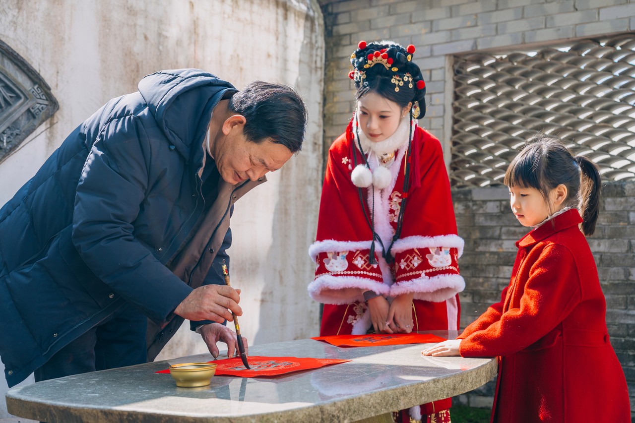 笔墨书香处,又是另一番年味景象。书法老师现场挥毫,为村民们写春联、送福字。红纸铺展,墨香飘散,一句句祝福在笔尖流淌。70多岁的村民卢大爷接过墨迹未干的福字,端详着上面饱满圆润的笔画,笑得合不拢嘴:“这手写的福字才有味道,贴在家里,福气就到家了!”