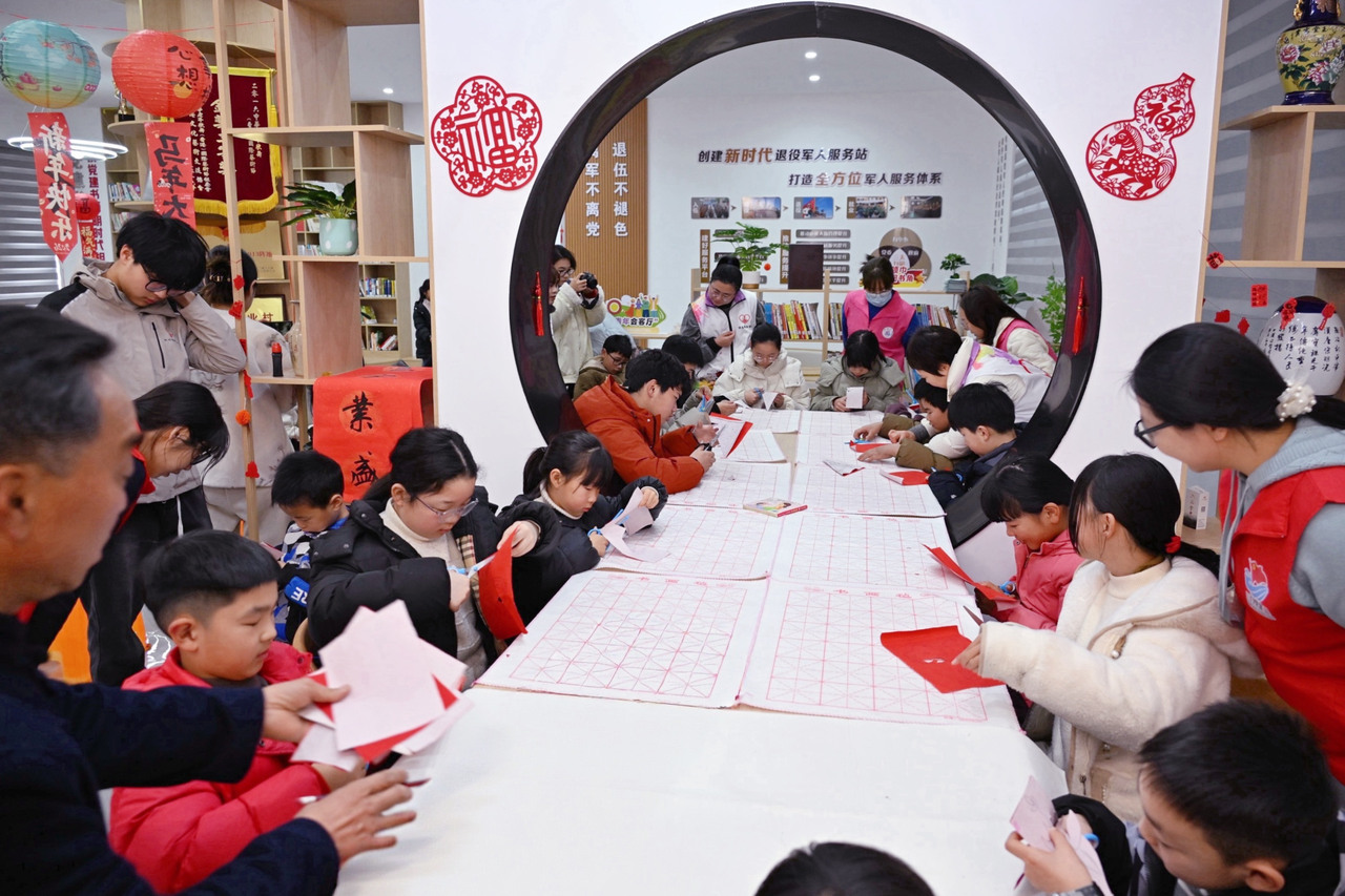 “这个‘福’字的撇,该这样写。”书画区里,寒假返乡的大学生郑宇翔握着孩一笔一划一笔一划教写“福”字。