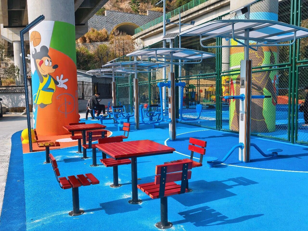 运动设施一应俱全,包含1个半场篮球场、1个标准篮球场、1个网球场、3个羽毛球场,并配备了健步机、上肢牵引器、太极揉推器等多种户外健身器材。四周的桥墩上绘满了运动主题的卡通图案,为冰冷的桥墩注入了艺术活力;为解决市民停车难题,公园还贴心地配备了34个机动车停车位及若干非机动车停车位。