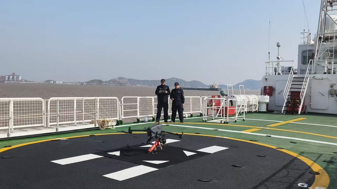 客船鸣笛离港,无人机随即切换为“伴航模式”,全程监控船舶周边水域动态,通过通讯设备与船舶保持联络,及时提供航行安全信息与预警,成为船舶驾驶员的“空中瞭望哨”。