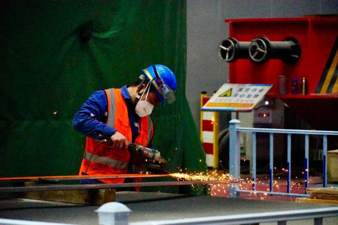 步入4号机组安装区,只见起吊机来回运转,将离相封闭母线从货车上卸下。一旁,2名工人戴着头盔、护目镜与口罩,正弓着背打磨转子磁极键,火花四射。