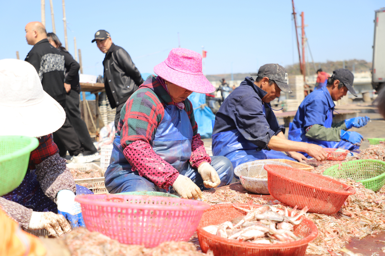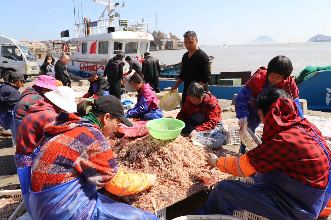 图为松门镇石板殿码头上,渔民们在分拣小海鲜。