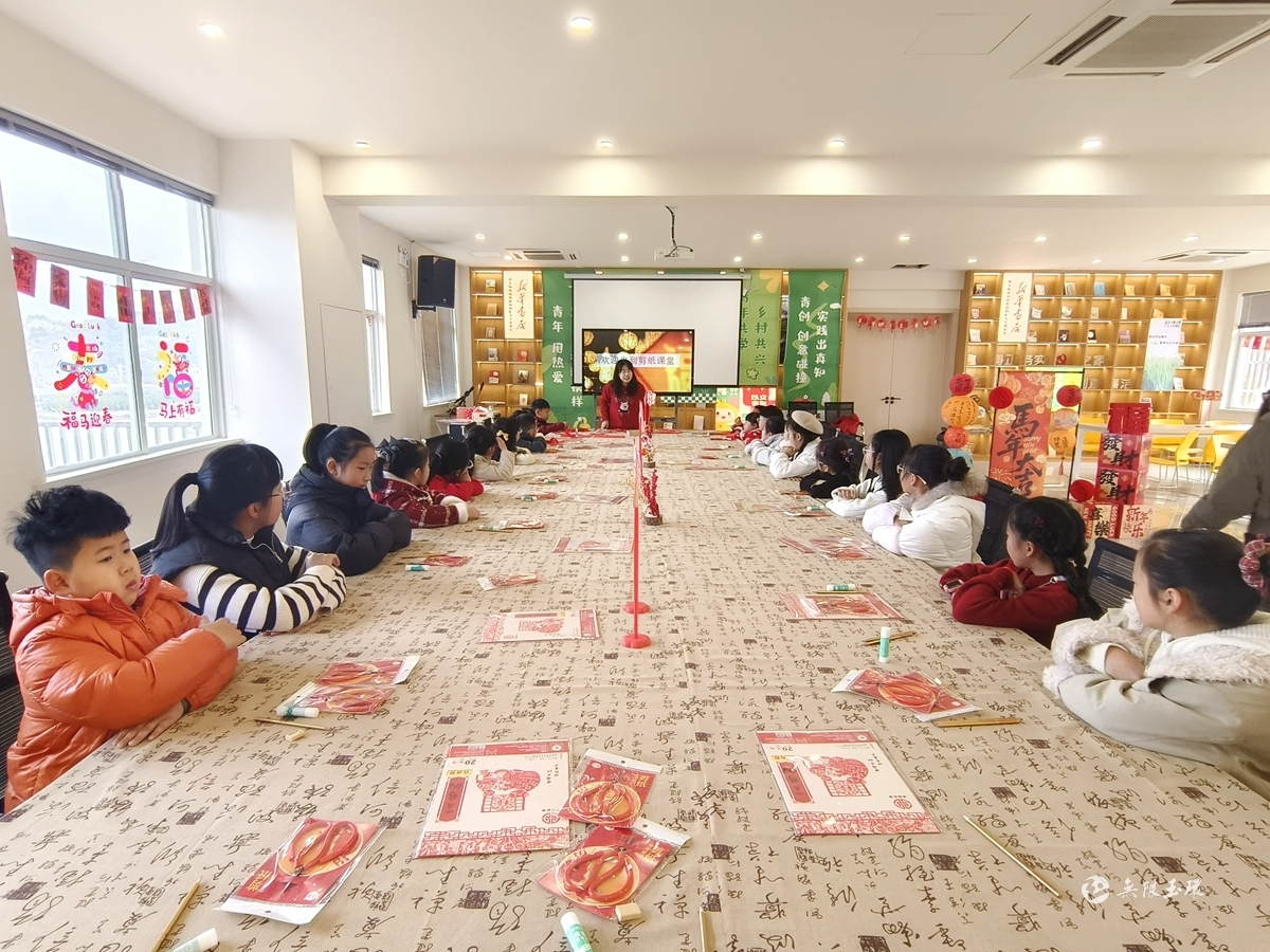 春节期间,由市委宣传部举办的“作家专家名家进书屋”系列活动走进文旦花开新型阅读空间,邀请清港小学美术教师冯明民为在场的20多名孩子带来代表性非遗剪纸体验活动。在现场,孩子们围坐在桌前,在老师的耐心指导下,专注地进行剪纸创作。“大家注意挂绳的位置,我们沿着这里慢慢剪……”身着红衣的老师俯身示范,手把手传授剪纸技巧。