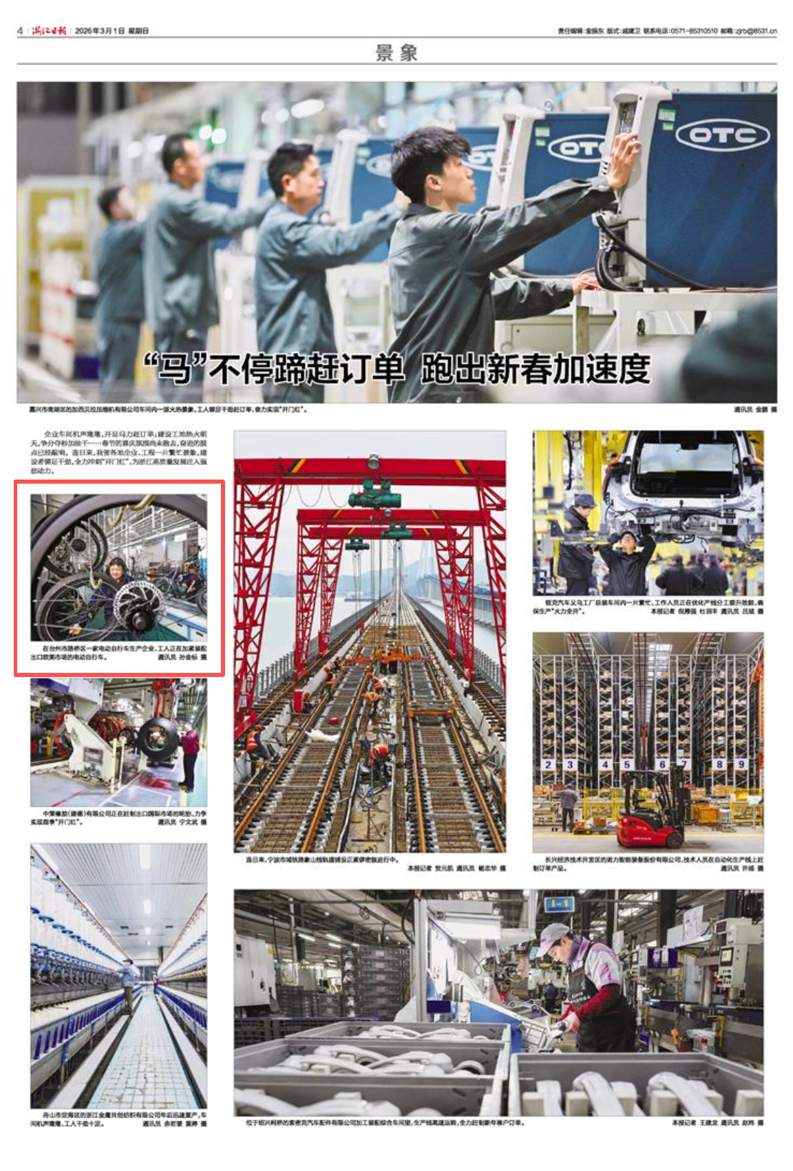 企业车间机声隆隆,开足马力赶订单;建设工地热火朝天,争分夺秒加油干……春节的喜庆氛围尚未散去,奋进的鼓点已经敲响。连日来,我省各地企业、工程一片繁忙景象,建设者铆足干劲,全力冲刺“开门红”,为浙江高质量发展注入强劲动力。