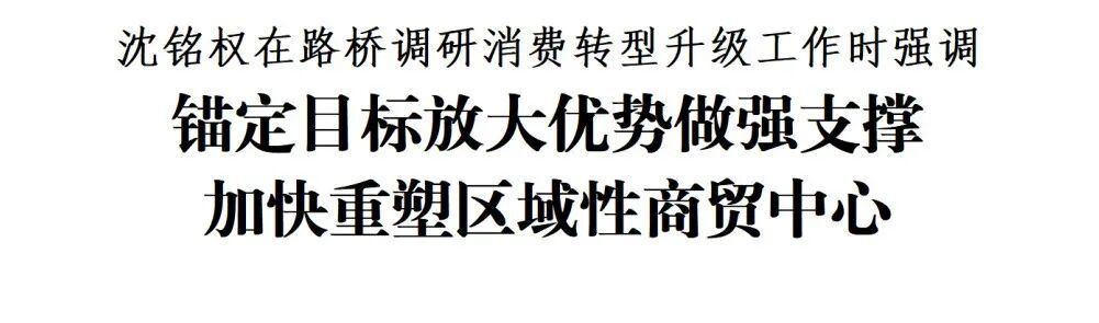 3月2日下午,台州市委书记沈铭权在路桥区调研消费转型升级工作,强调要深入学习贯彻习近平总书记关于构建新发展格局的重要论述和考察浙江重要讲话精神,贯彻落实省委、省政府部署要求,围绕培育消费新产业、新业态、新模式,放大集成优势,做强市场支撑,加快重塑区域性商贸中心,为建设长三角陆海开放智造强市贡献更大力量。市委常委、秘书长陈挺晨参加。