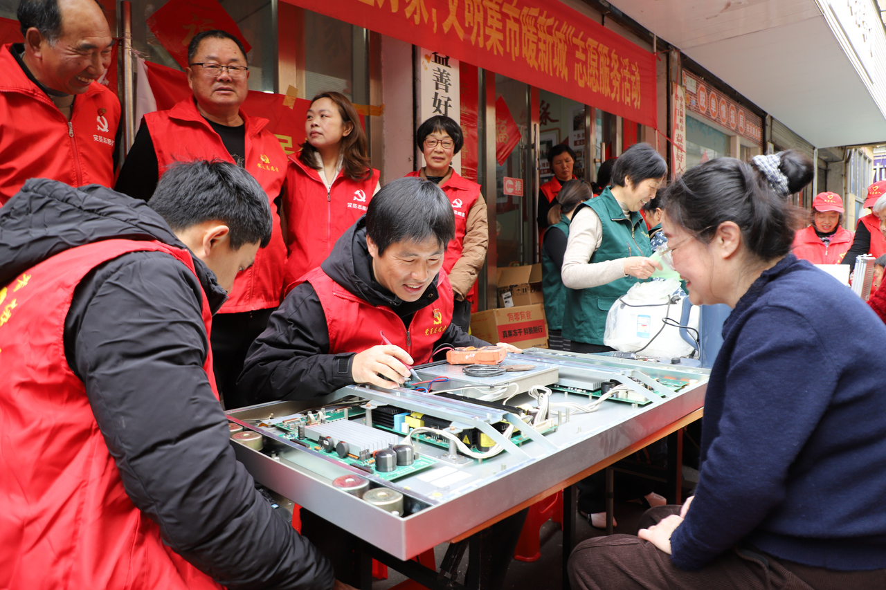 下午2时,松门镇葛家巷30号门口人头攒动,当地群众闻讯后纷纷过来“赶集”。各个服务摊位前,红色马甲与暖心服务交织成一道亮丽风景线: ——家电维修区人气旺。个体劳动者协会的党员志愿者化身“维修能手”,周边群众拎着故障电视机、热水壶、电饭煲等家电陆续赶来。现场工具箱齐备,螺丝刀轻旋、万能表跳动,不一会儿,1台电饭煲和1台热水壶便“重获新生”;一台老旧电视机因故障复杂需进一步检修,志愿者贴心地记下群众信息,承诺带回门店妥善维修。