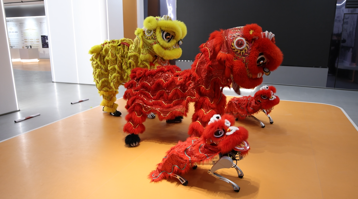 一对机器狗身披大红舞狮服,踩着鼓点摇头晃脑,与一旁的传统瑞狮默契配合。它们时而蹲起,时而摆尾,精准动作利落,狮头狮尾灵动十足。