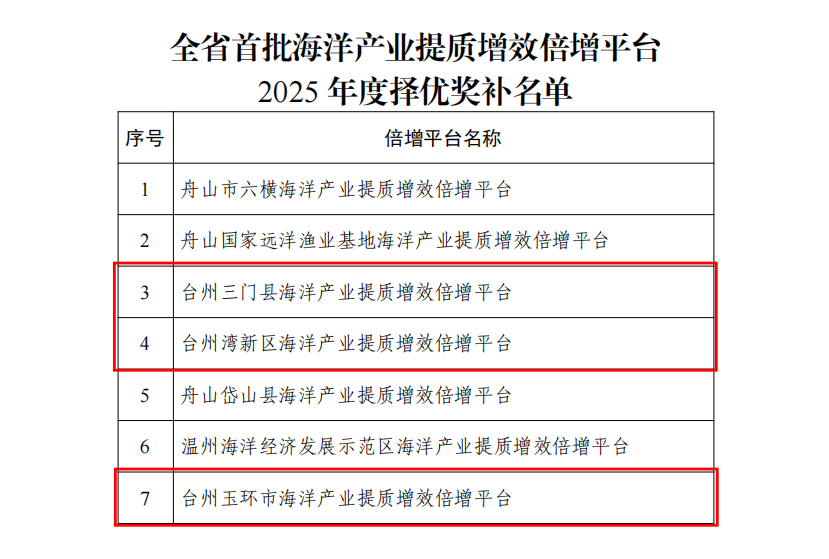 近日,浙江省海洋经济发展厅公布2025年度省级海洋产业提质增效倍增平台择优奖补名单,台州三门县、台州湾新区、玉环市三地平台成功入选,共获省级奖补资金1800万元,奖补总额位居全省第一。