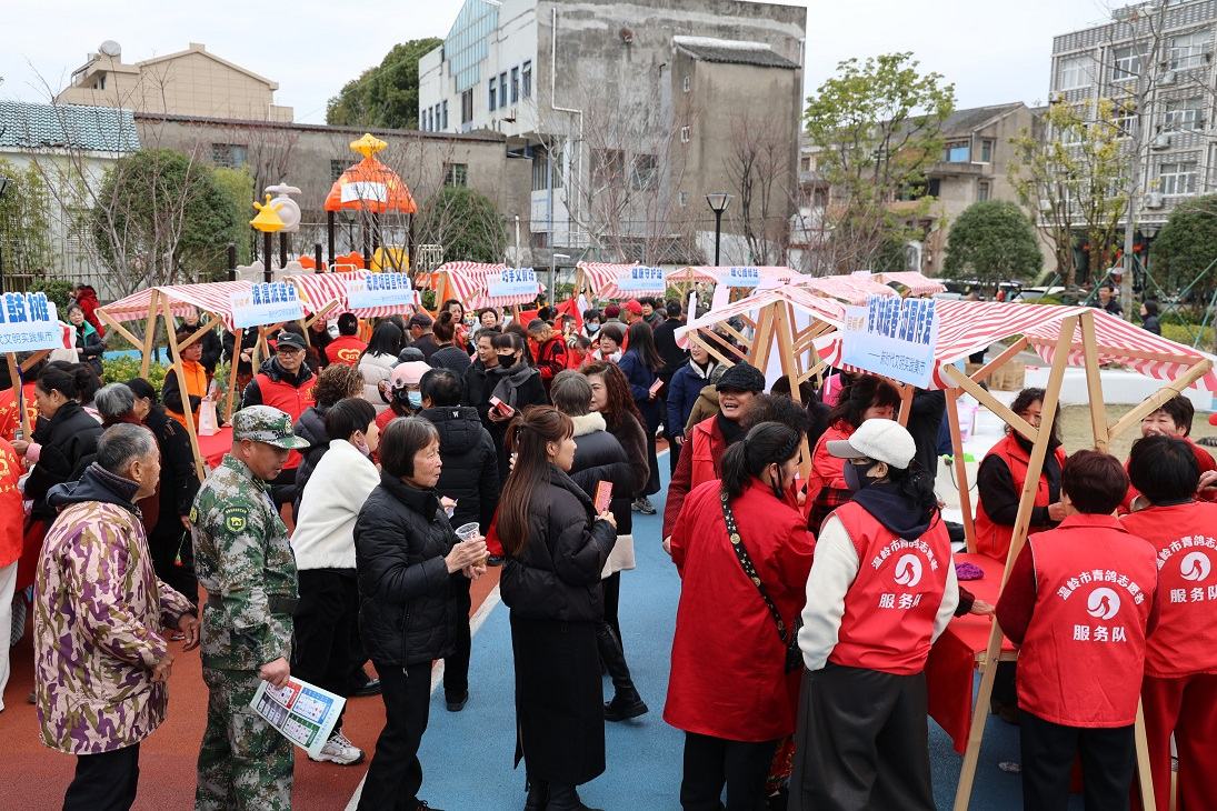 当天上午,在箬横镇团浦公园内,由粉白相间的棚顶、暖色调的支架所组成的摊位分列排开。这些摊位上,一侧站着印有各式队伍名称的红马甲和身着部门单位职业装的工作人员,另一侧市民穿梭其中,蜂拥打卡。