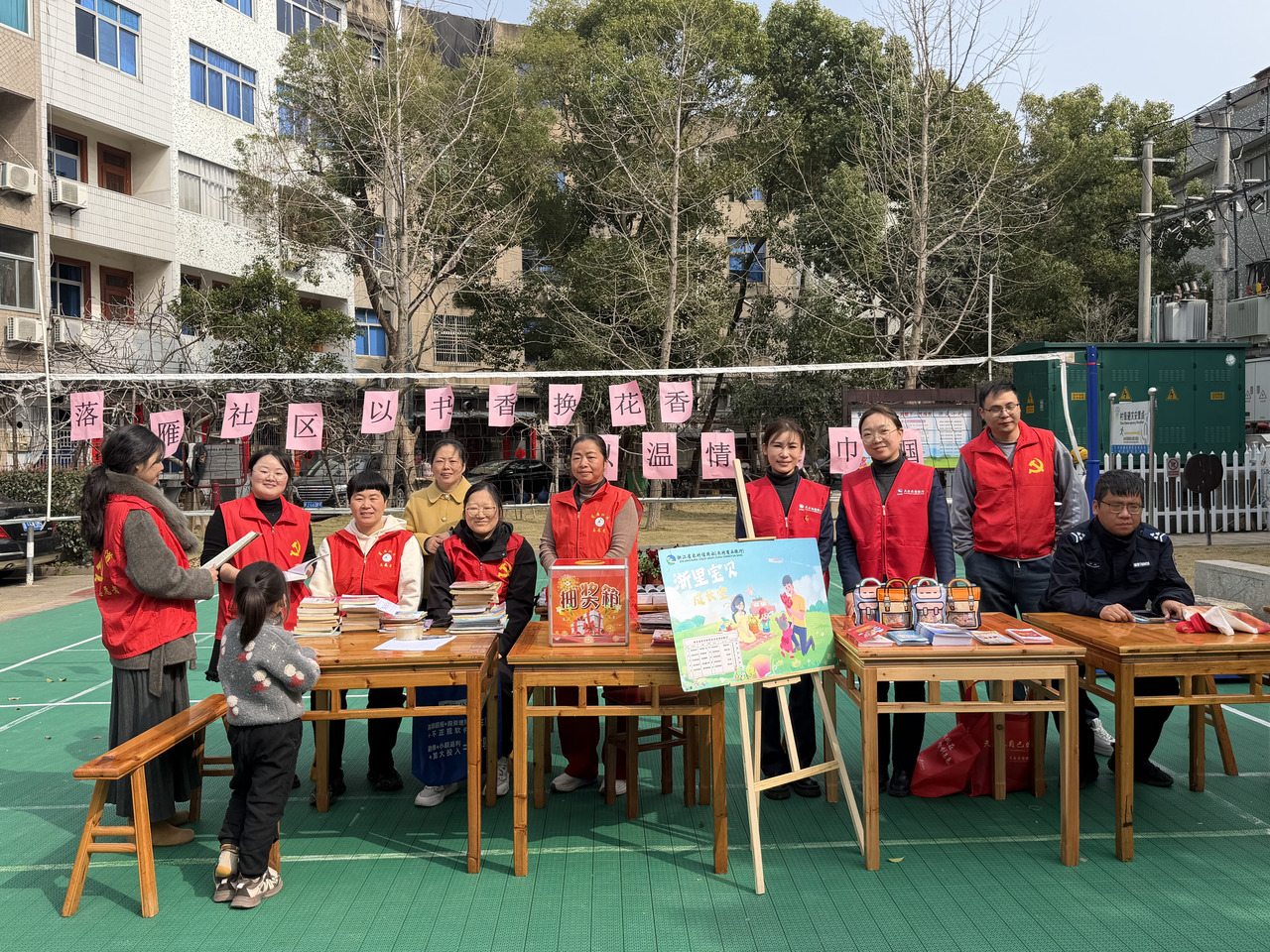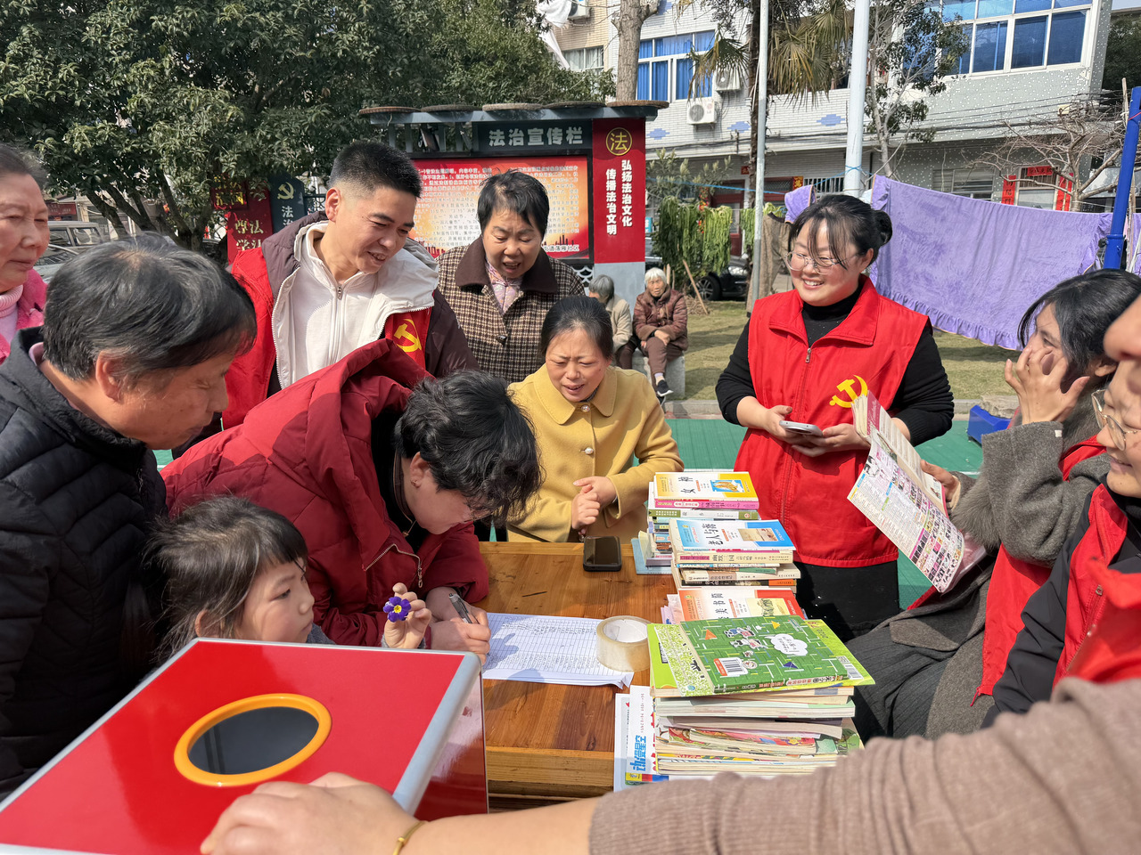 活动现场暖意融融,全民阅读推广与“护苗·绿书签”行动深度融合,成为活动核心亮点。“书香换书香·护苗共成长”专属环节中,居民们纷纷带来家中闲置正版书籍,涵盖女性生活励志读物、青少年绘本名著等各类优质读物,通过趣味抽奖兑换雨伞、花种子等礼品,既盘活闲置资源,更让书香在邻里间传递,助力全民阅读扎根基层。