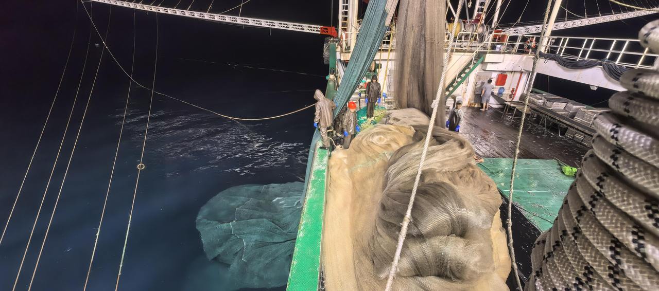 凌晨的印度洋,正是鱿鱼最活跃的时刻,也是“兴邦902”号的“赚钱黄金期”。海面上,四根巨臂缓缓展开,一张周长360米的大网如巨伞般在船底撑开,随即沉至水下80余米,将鱿鱼群一网打尽。