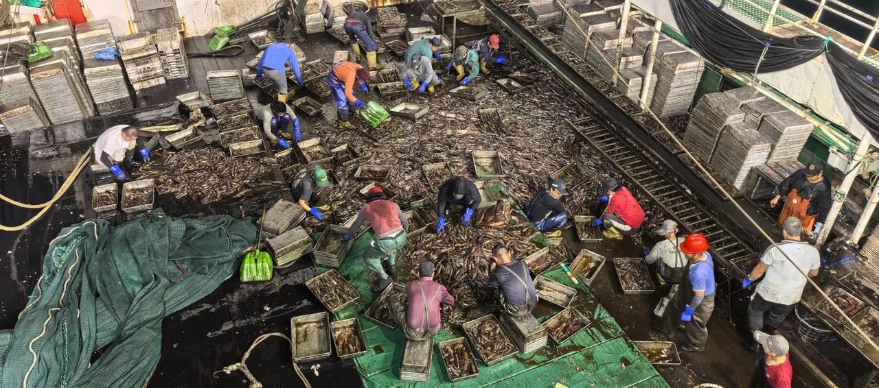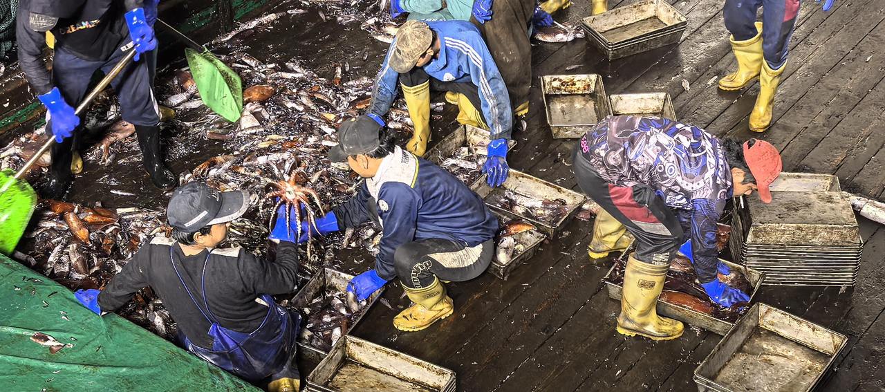 凌晨4点,新一网渔获上船,14名中国船员、6名印尼船员、8名菲律宾船员,在铺满鱿鱼的甲板上忙得热火朝天。分拣、装盘、定重、整理、贴标,一系列流程行云流水,丝毫不敢耽误——鲜度,就是鱿鱼的价值所在。随后,分拣好的鱿鱼被送入零下32摄氏度的速冻室,经8小时急冻,牢牢锁住鲜味,次日下午便可包装下仓。