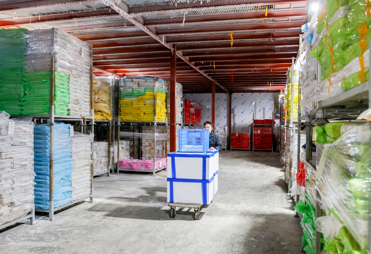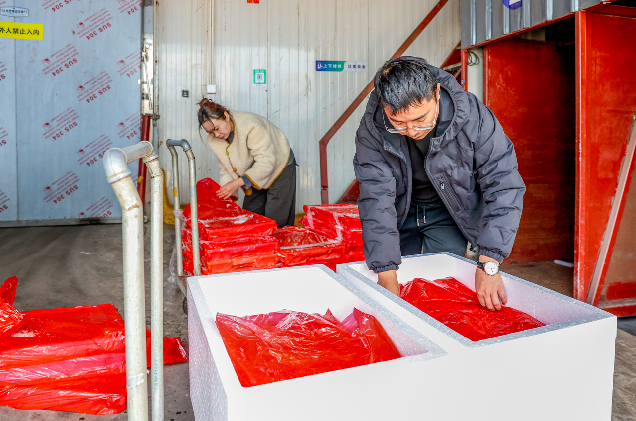 “我们给主播达人供货,他们负责带货。最高纪录是一场直播卖出3万多斤红虾,最远卖到乌鲁木齐。”孙成波说,红虾越卖越好,一年要向渔民收购400吨左右的船冻虾。