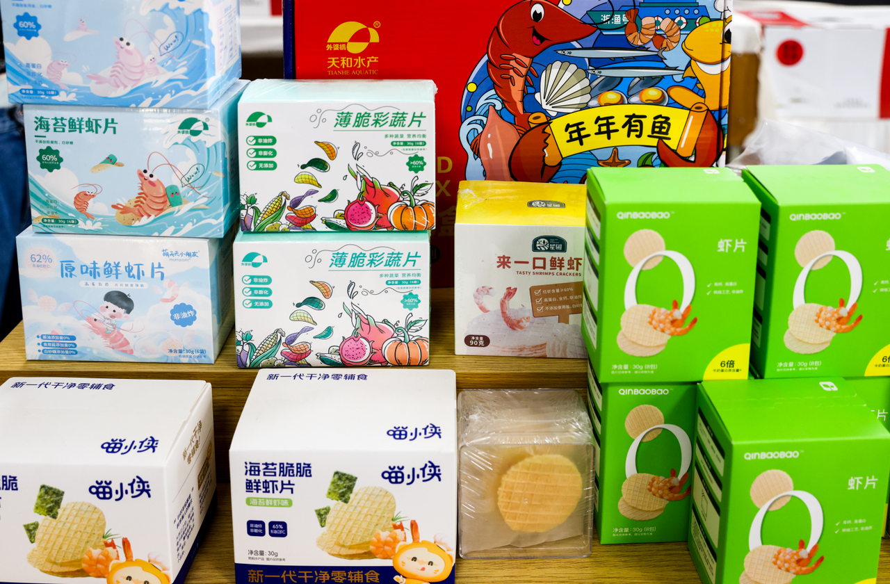 “2021年8月,我们打通了母婴销售渠道,开始琢磨做什么产品有优势。红虾是温岭本地特色海鲜,海捕虾比养殖虾更健康。我们就定下来,用红虾做原料,开发零食。”余训新说,现在,他们给品牌做代加工,红虾休闲零食一年能销售600万元左右。