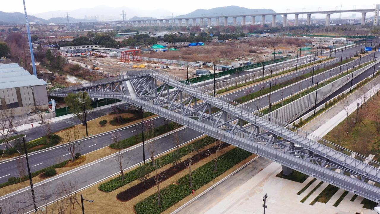 微丘运动场的一侧,是乌石花海区块。尽管目前还未到花期,但层层叠叠的绿色,仍绽放出了盎然生机。绿植丛中,架着一座钢桁架结构的桥梁。这座桥叫乌石河桥,它横跨和合大道,总长130米,通行宽度4.9米。站在桥上远眺,滨江风光尽收眼底。