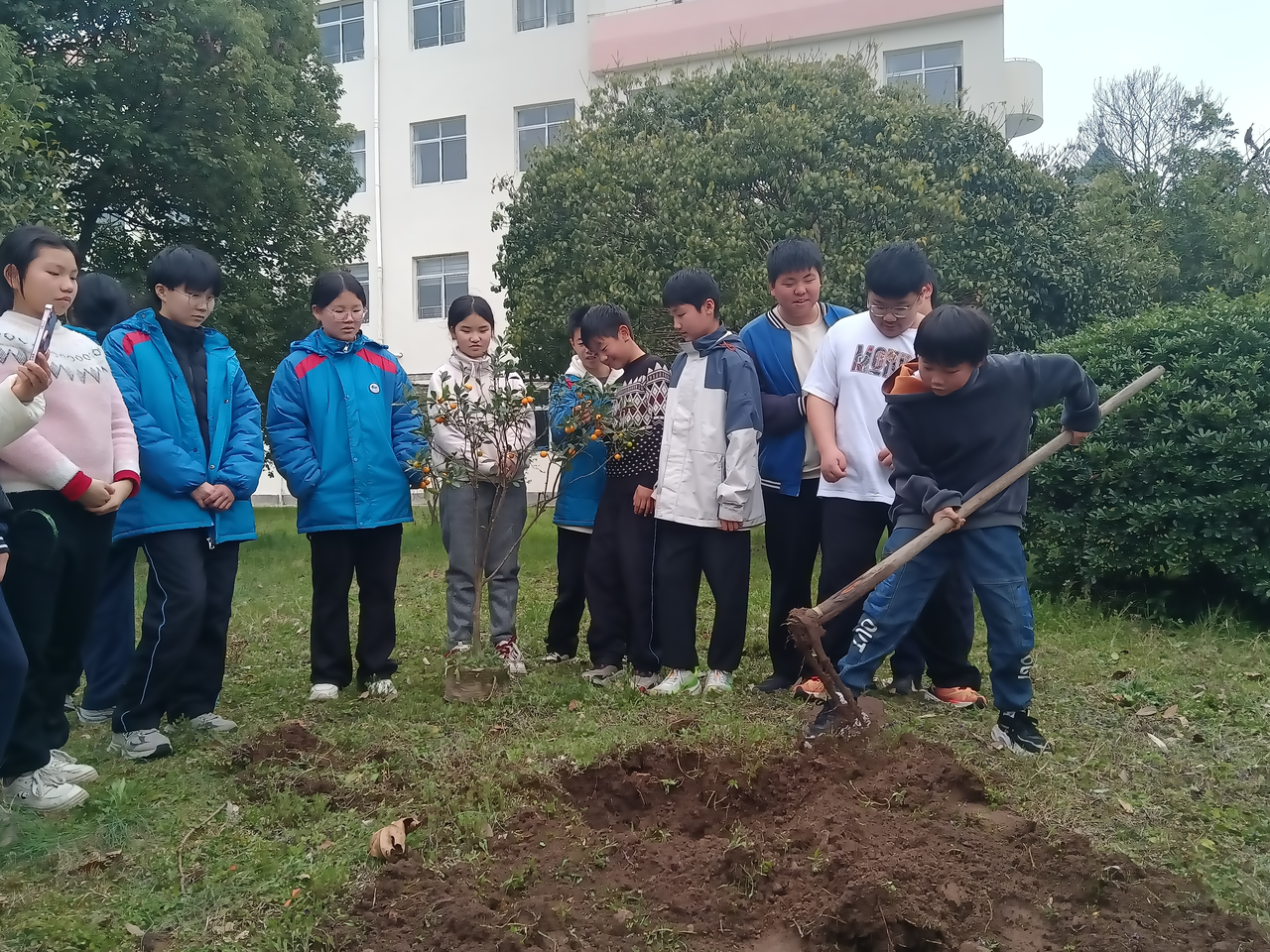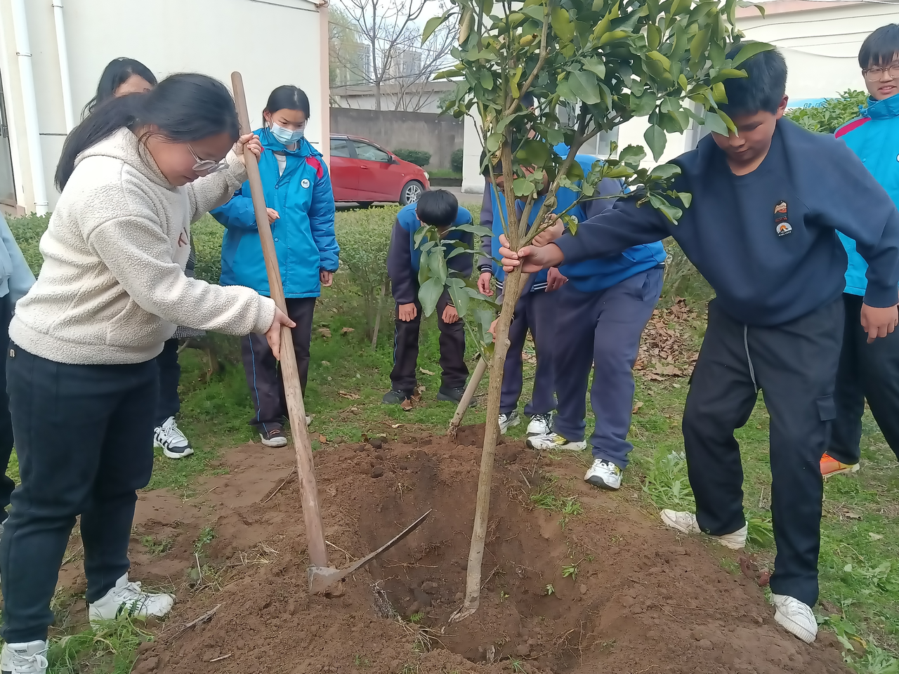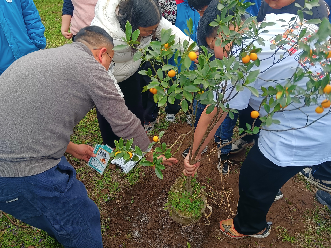 培训结束后,师生们分组前往校园规划的“劳动实践基地”,一场热火朝天的种植活动正式拉开序幕。同学们在教师的指导下,分工协作、干劲十足:有的挥锹挖坑、有的扶苗定位、有的培土压实、有的浇水灌溉,每一个环节都做得认真细致。大家相互配合、默契十足,脸上洋溢着劳动的喜悦,汗水浸湿了衣衫也丝毫没有减退热情。教师们穿梭在各个种植小组间,随时答疑解惑、示范指导,确保每一棵果苗都能规范栽种。经过近两小时的辛勤劳作,一棵棵枇杷树、金桔树、柿子树整齐排列在基地中,为春日校园增添了一片生机勃勃的新绿。