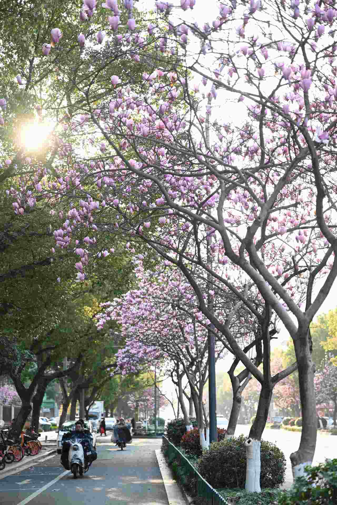 沿着巾山东路前行,两侧玉兰树整齐排列。粉白相间的玉兰花缀满枝头,与澄澈的天空相映成趣。阳光透过花瓣洒下斑驳光影,几片花瓣随风落下,仿佛把一个春天都定格在了人来车往的街巷之间。
