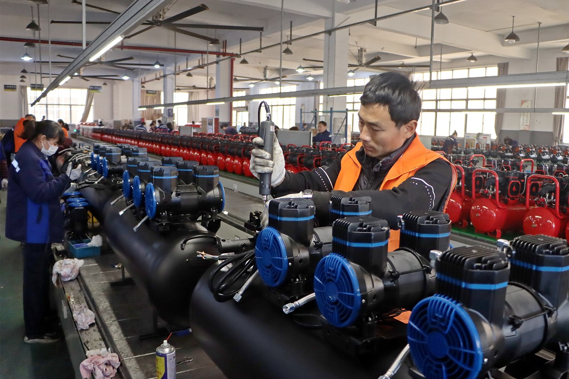 依托多年客户积累,奥利达海外订单已排至2026年6月,覆盖欧洲、俄罗斯、日韩等核心市场,订单总额超五百万美元。走进公司生产车间,机器轰鸣、流水线高速运转,一片繁忙景象。“目前日均出货空压机2000台、喷枪3000-4000套。”公司总经理林帮法介绍。