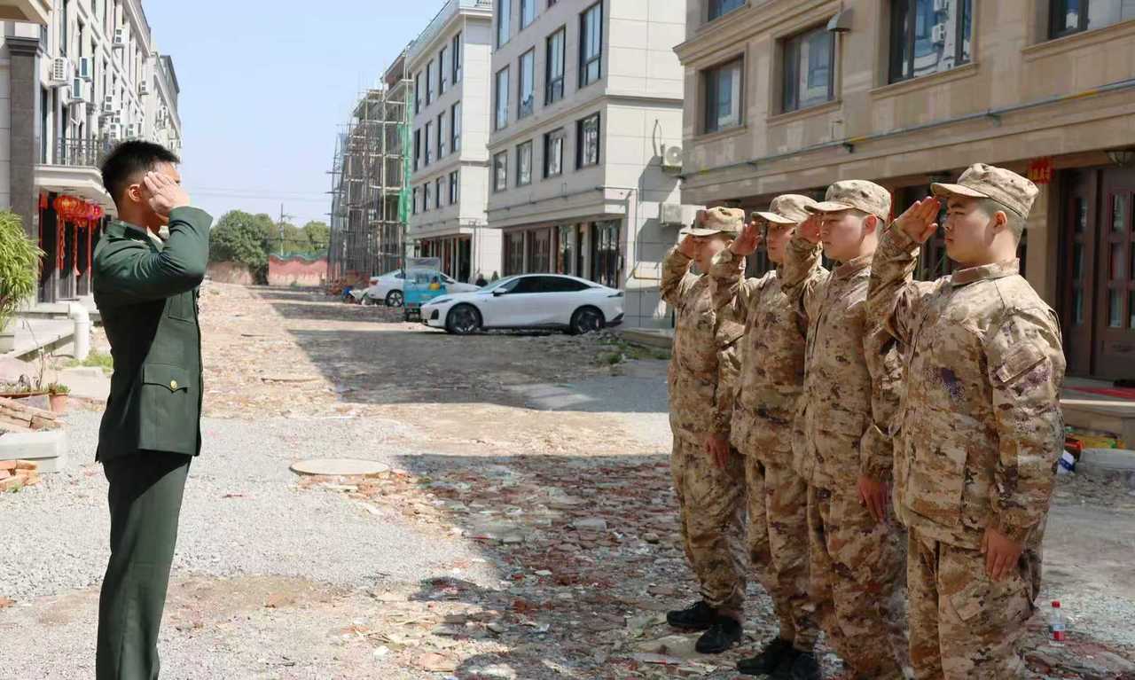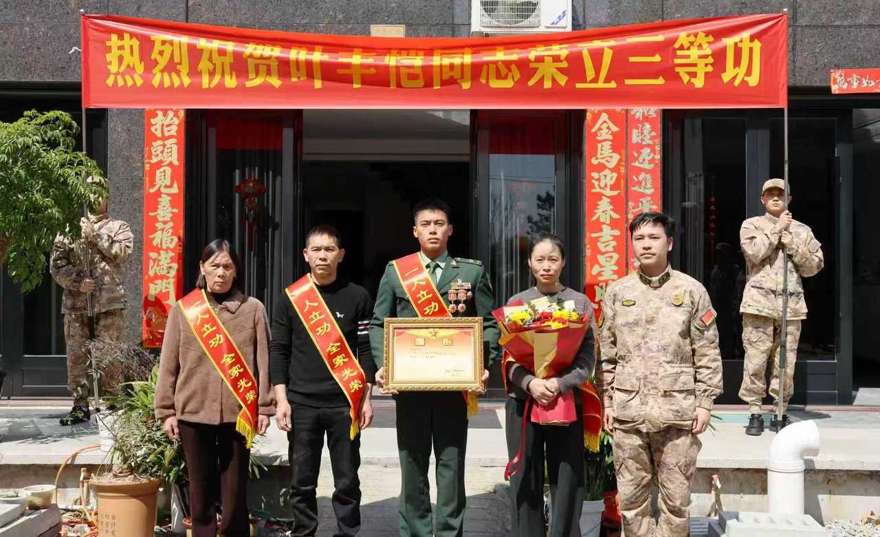 3月11日正午,伴随着锣鼓声,台州市路桥区路南街道的预定新兵们便整齐列队,他们手捧鲜花和喜报,举着写着“热烈祝贺叶丰恺同志荣立三等功”的横幅,来到现役军人叶丰恺的家中。叶丰恺身着笔挺的军装,胸前的勋章在阳光下熠熠生辉,他向前来送喜的街道武装部同志以及新兵们敬了一个标准的军礼。