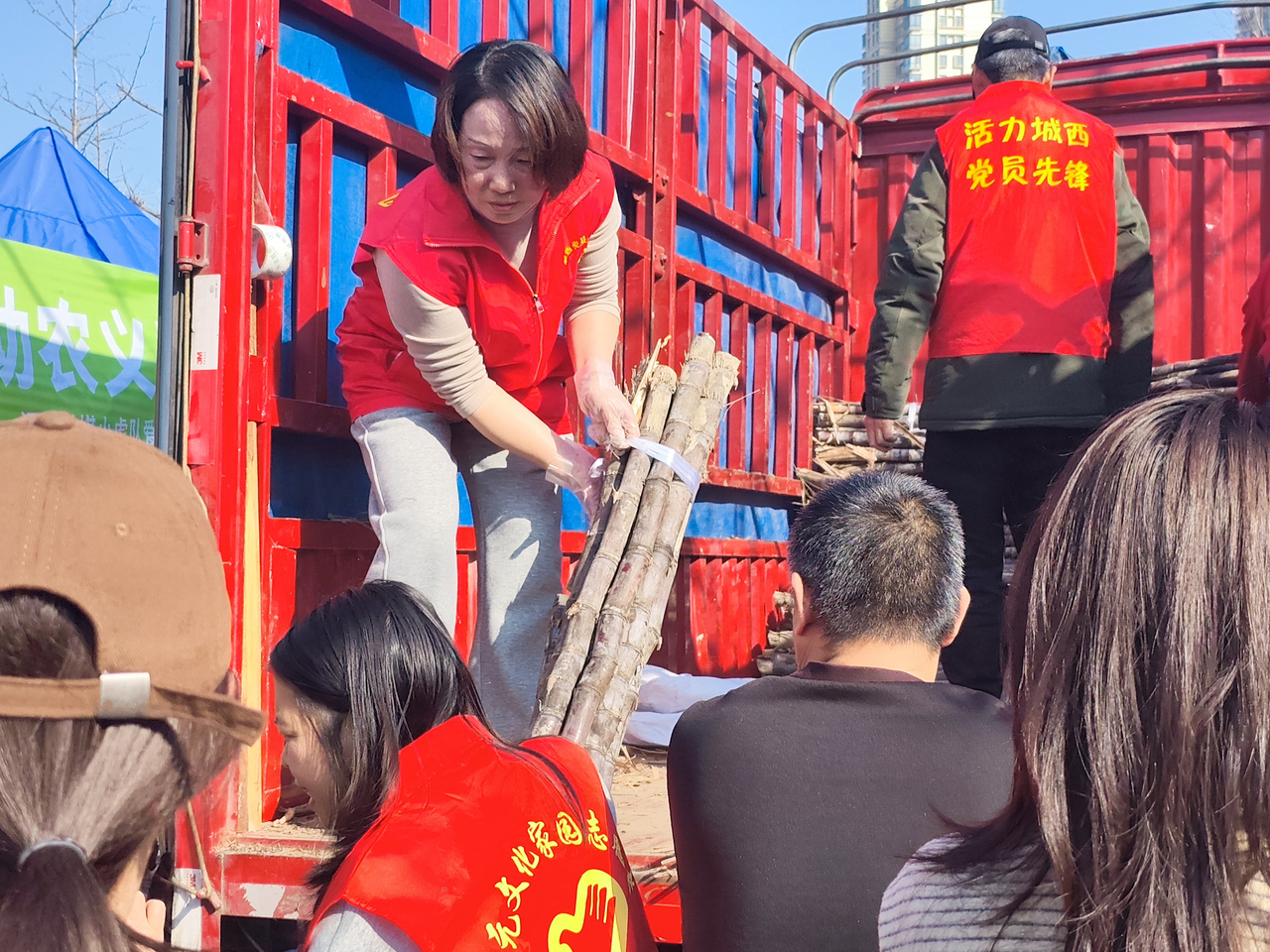 3月14日至15日正值周末,开元社区的党员志愿者们主动放弃休息,组建“甘蔗义卖群”,方便居民线上接龙下单。从统计订单到收货配送,他们全程跟进,联动小区业委会和物业,将一捆捆重达60来斤的甘蔗直接送到居民家门口。贴心服务赢得居民纷纷点赞:“多买点,帮农户早点卖完!”短短两天,累计助销甘蔗2000余根。