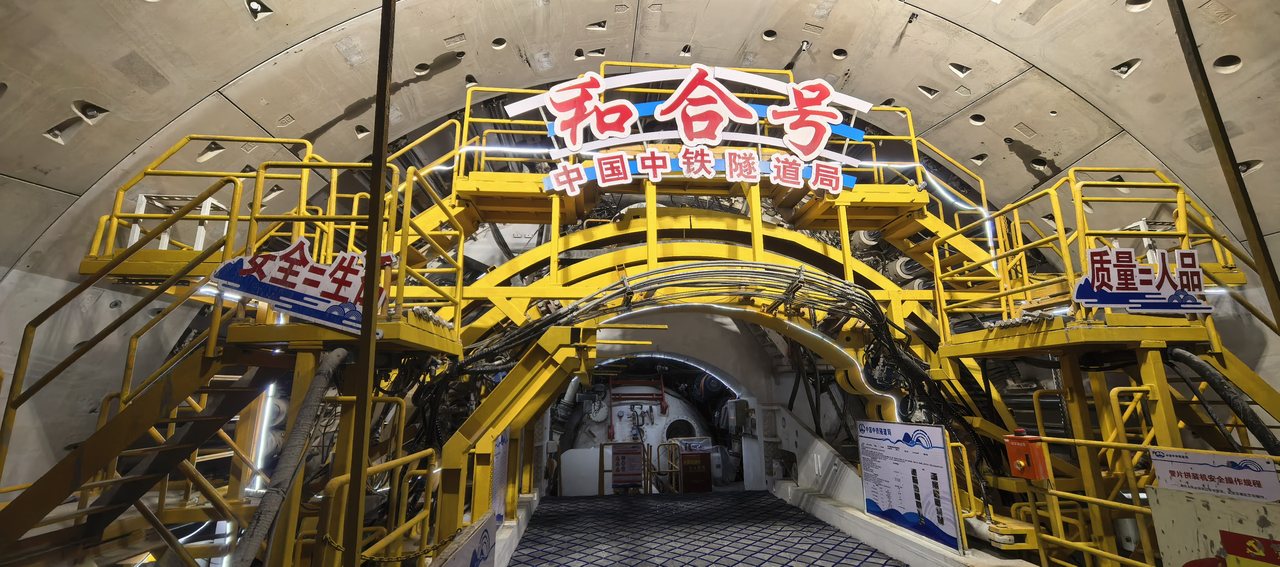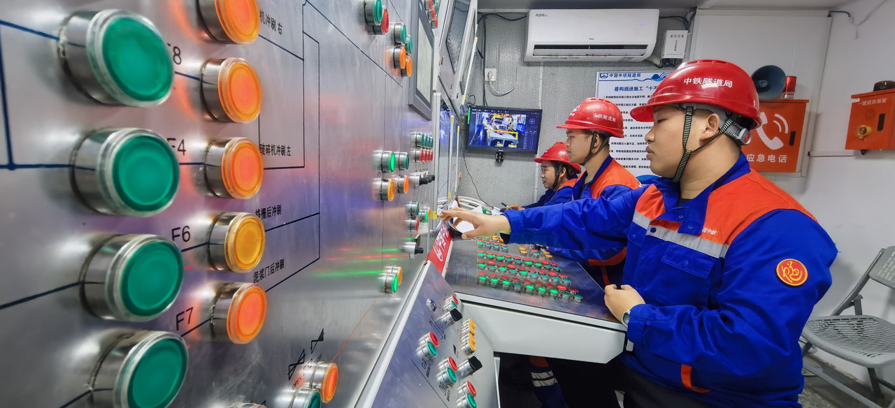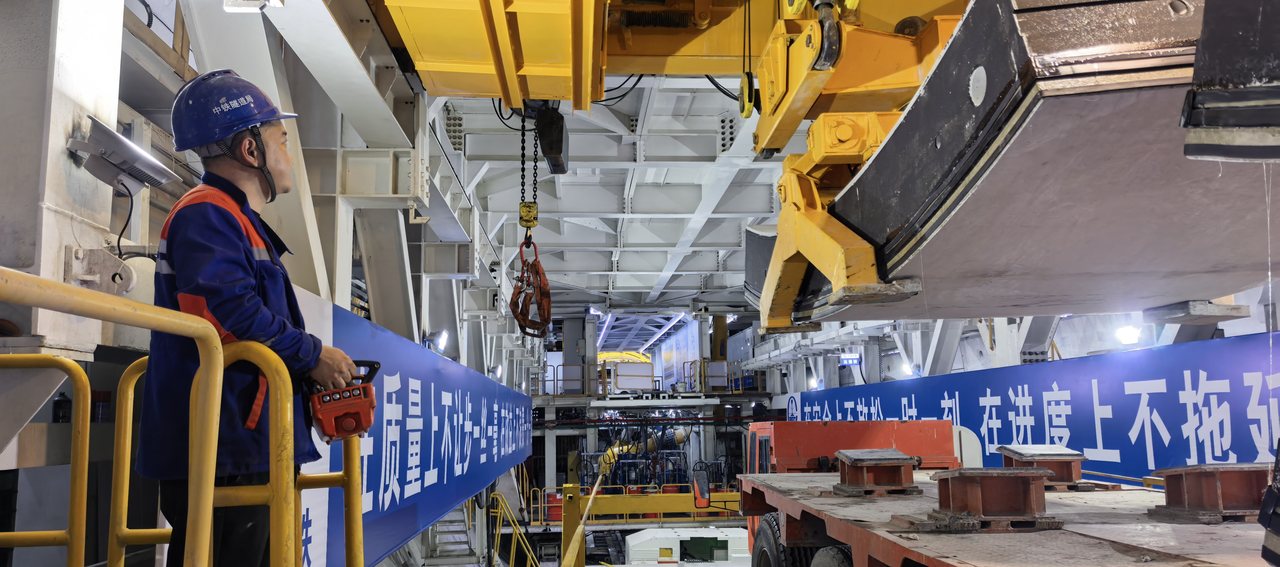 走进项目施工现场,管片吊机精准作业,平稳吊运着隧道管片,箱涵智能拼装机器人高效运转,与现场施工人员紧密配合、协同作业,管片定位、拼接等工序有条不紊开展,机械轰鸣与人员忙碌交织,处处展现出攻坚奋进的建设热潮。为抢抓关键工期节点、破解施工技术难题,项目采用15.01米级超大直径泥水盾构机,设备刀盘重量达580吨,主机总重超过2000吨,为隧道掘进提供了硬核装备支撑。