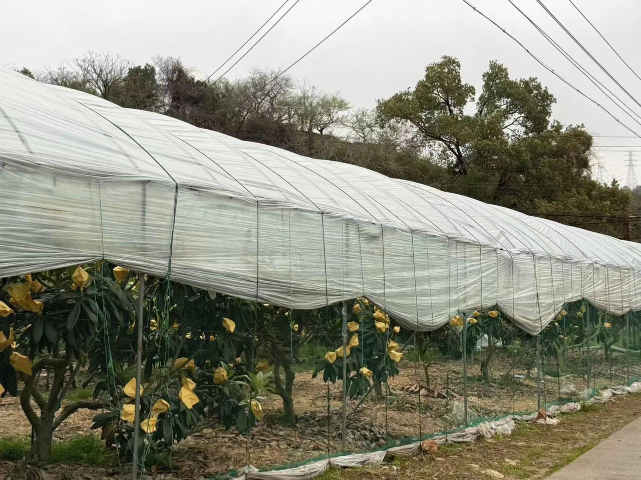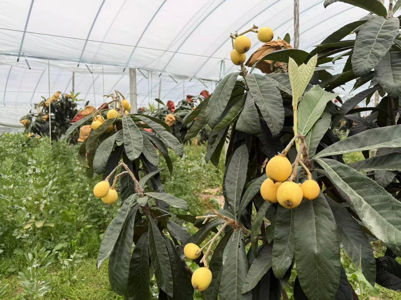 沙门镇岳鑫村根心果园大棚内,枇杷也即将进入成熟期。果园负责人表示,相比露天种植,棚栽枇杷能提前20多天至一个月上市,核心秘诀在于大棚设施与精细化养护技术。