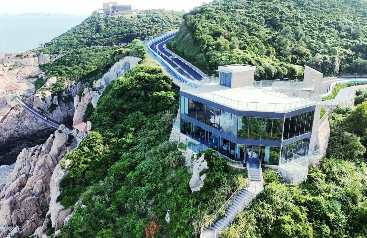 从甲午岩景区主入口步行100多米,观澜台海景书吧悠然出现在眼前。它原是游步道上一处供游客歇脚的休息驿站,2024年底改建为书吧后,保留了原有的休憩功能,又赋予了它文化空间的灵魂。书吧以玻璃与天然石材为主材,一二层是通体落地玻璃窗,顶层为延伸而出的观景平台,建筑线条简洁流畅,像是从崖壁上自然生长出来。