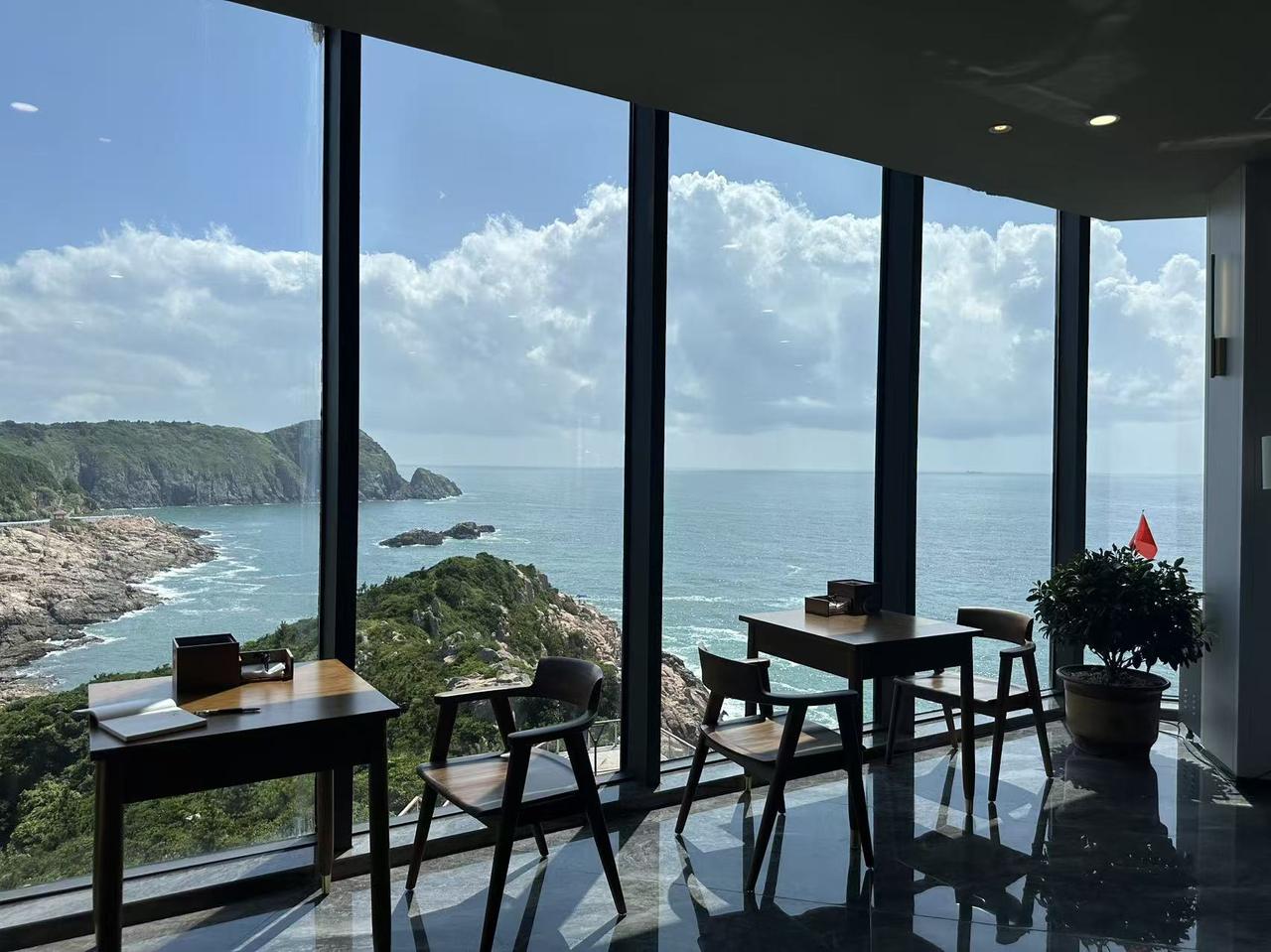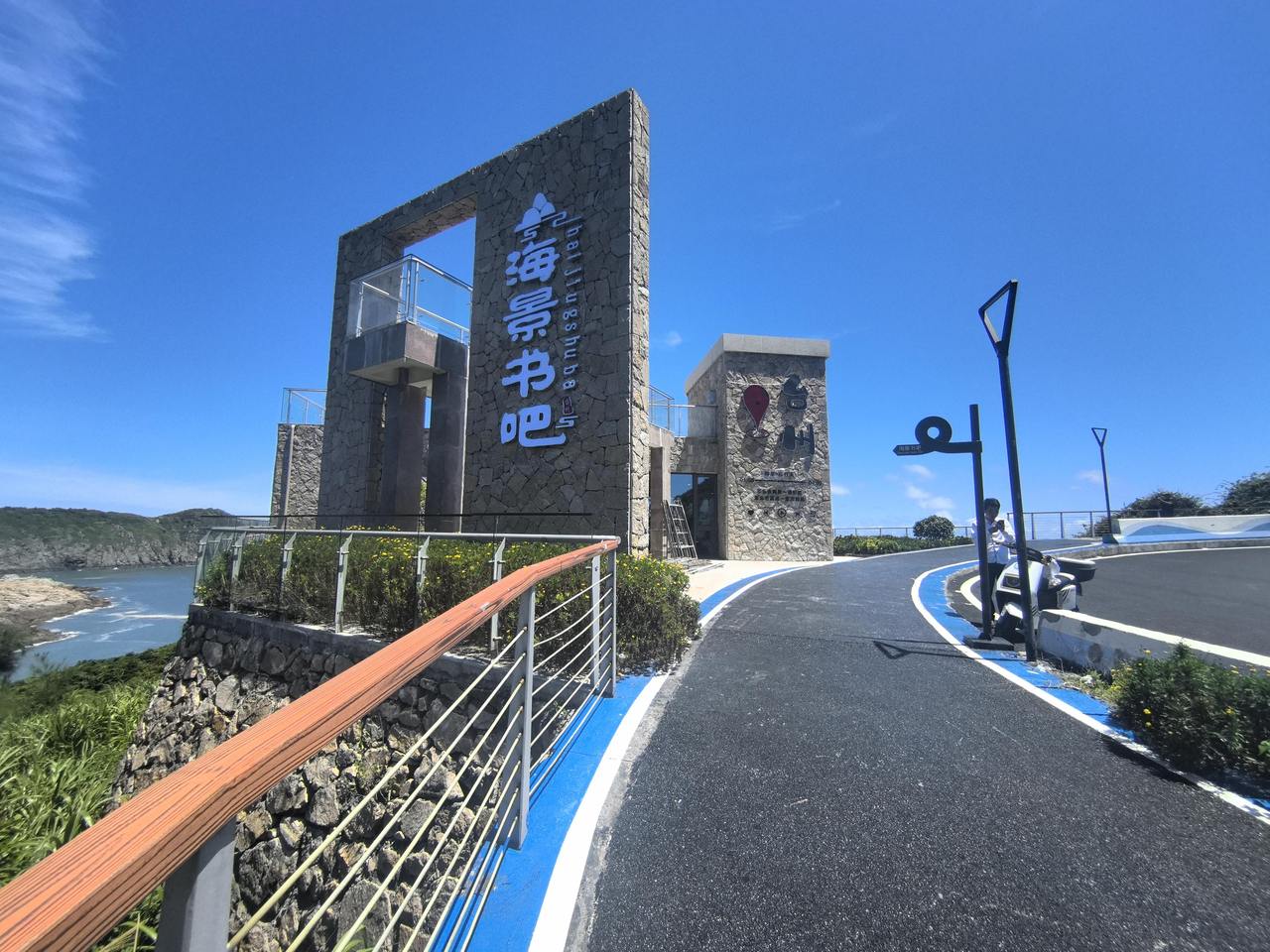 登上三层户外观景露台,眼前豁然开朗。整片海域尽收眼底,甲午岩在波涛中巍然矗立,远处的洋面波光粼粼,归港的渔船划出白色浪痕。露台上摆放着几组藤编桌椅,游客们或凭栏远眺,或倚坐翻阅,海风翻动着书页,也翻动着每个人的心绪。