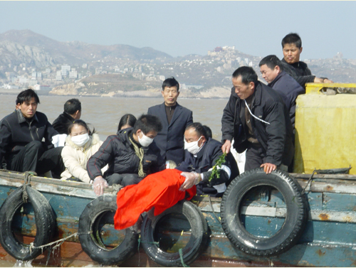 2006年2月6日,石塘某海域,叶顺正的亲友围在船边。他们遵从其生前遗愿,将骨灰伴着金菊花瓣缓缓撒入大海,完成了温岭第一例民间自发海葬。