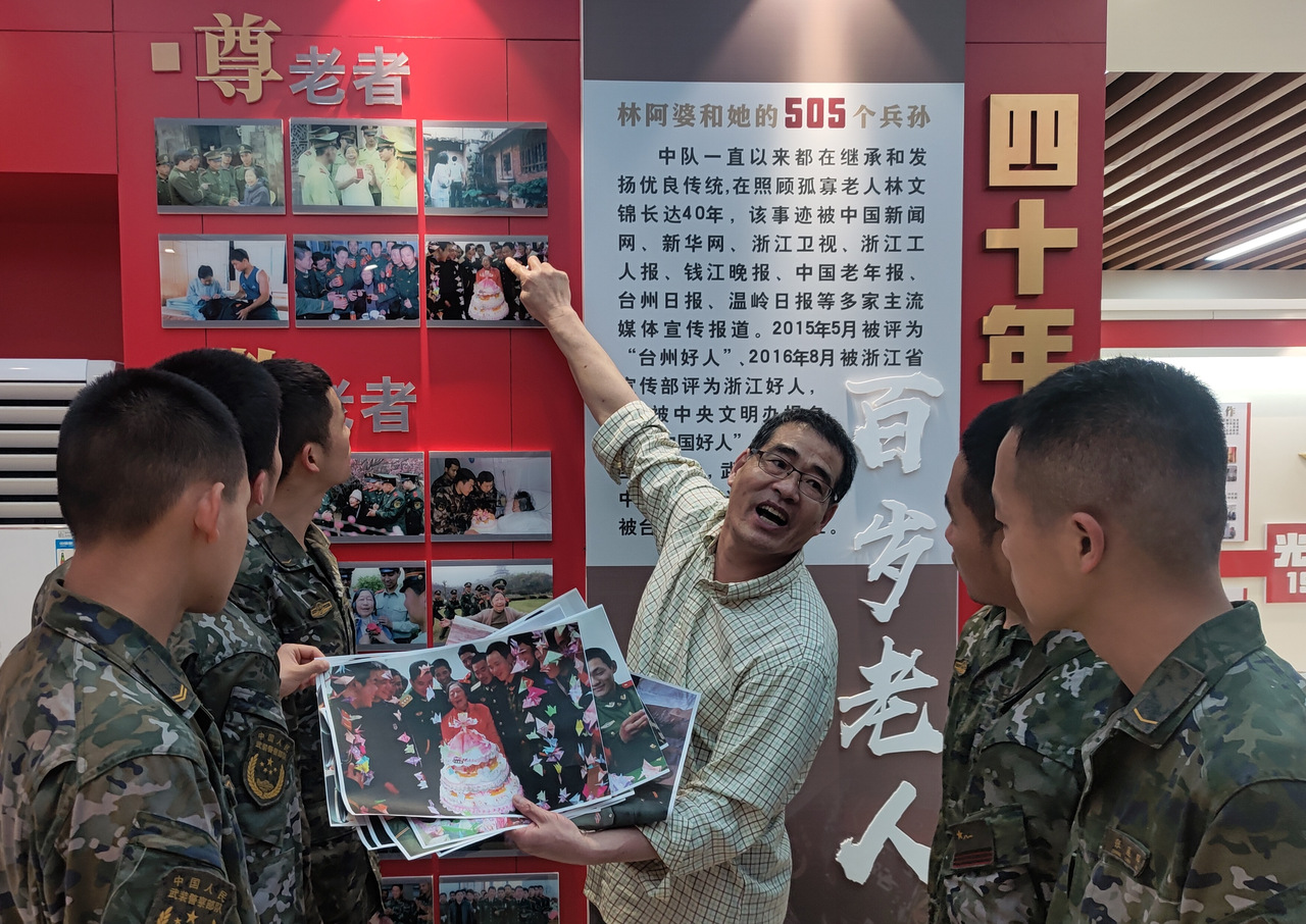 老兵江永兵在武警浙江总队台州支队执勤三大队温岭中队的营区里,给新一代官兵讲授中队与驻地失独百岁老人林阿婆40年相濡以沫的故事。