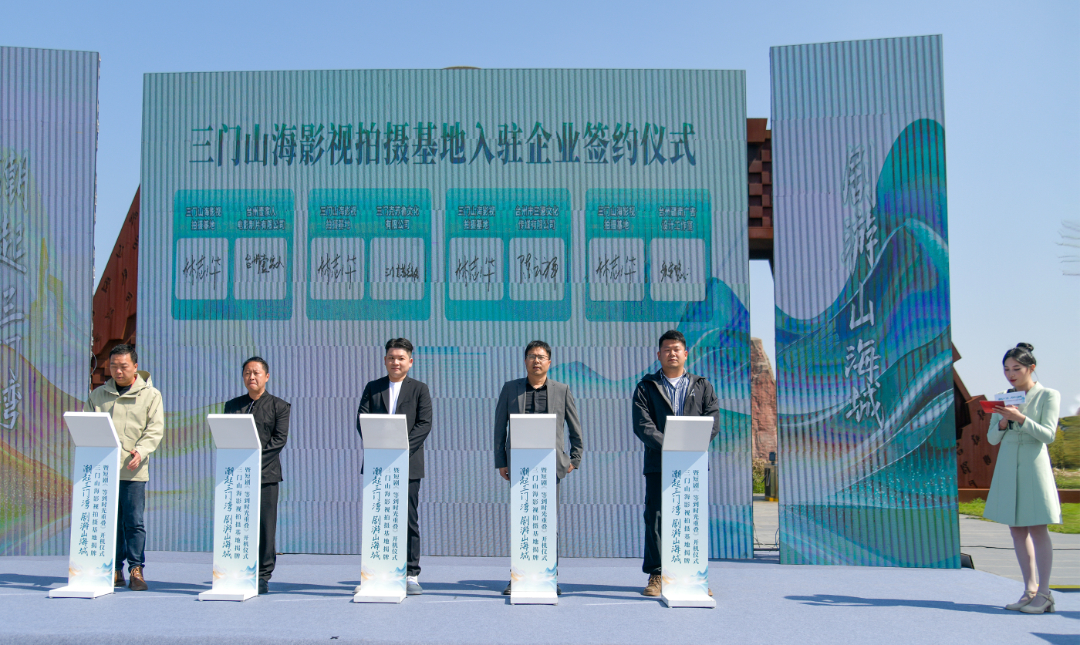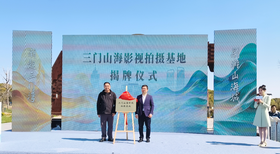 仪式现场,在众人期待的目光下,台州市文化旅游投资发展有限公司董事兼总经理叶天恩、县委宣传部副部长俞建余共同为三门山海影视拍摄基地揭牌。随后,首批入驻山海影视拍摄基地的四家影视文化企业正式签约。