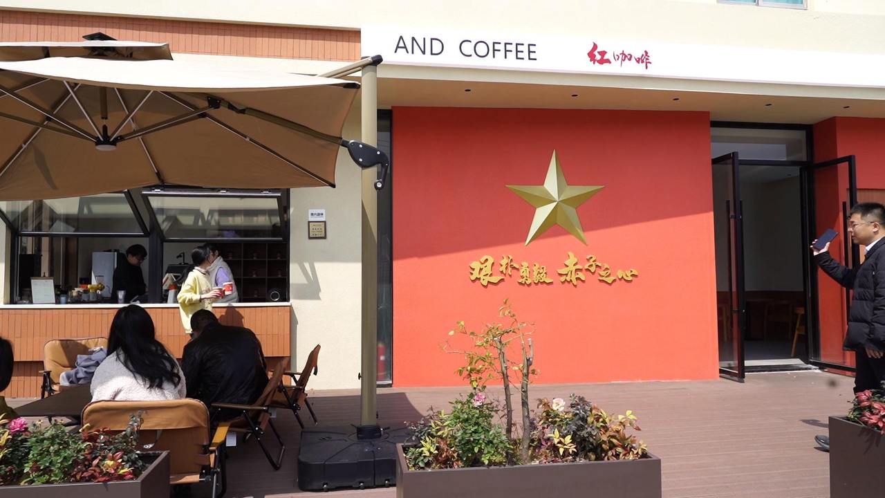 红色主题咖啡厅,是红山村的知名打卡点,它毗邻红十三军二师烈士陵园,很多年轻人都会来这里坐一坐,参加红色活动。“来之前我也了解过,红山村是红十三军二师烈士陵园的一个所在地,而这家咖啡馆叫‘红咖啡’,取的名字挺有意义的,整个氛围也是在弘扬红色文化。”游客说。