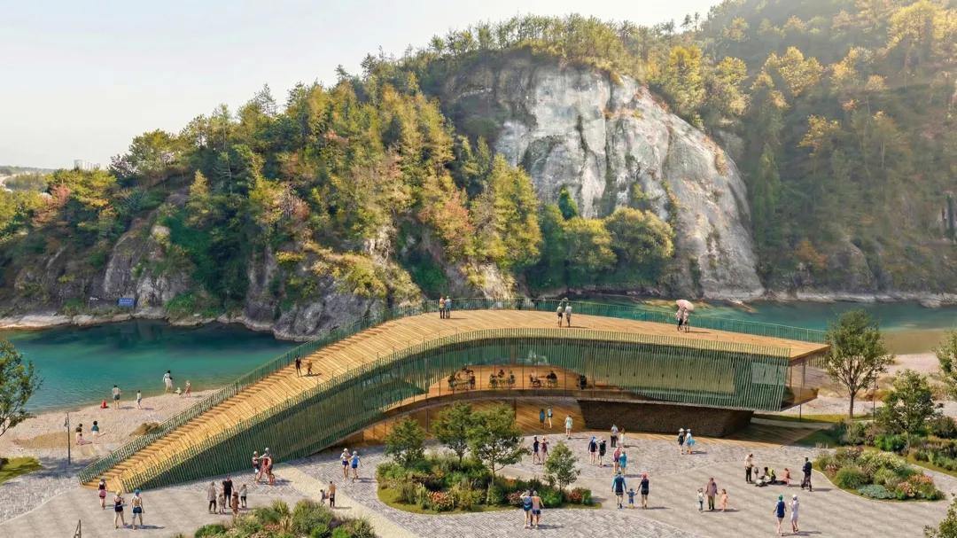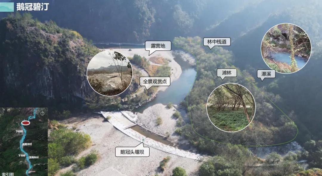 “鹅冠碧汀”围绕鹅冠头堰坝打造观瀑、野营、休闲复合功能区,升级“遇见·驿”综合服务中心,新建“浮碧台”观景平台。
