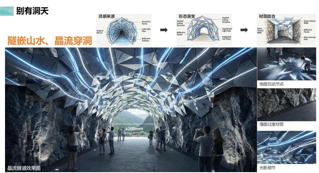 “别有洞天”将废弃隧道改造为光影艺术空间,依托镜面不锈钢与动态光影,打造“隧嵌山水、晶流穿洞”的奇幻体验。