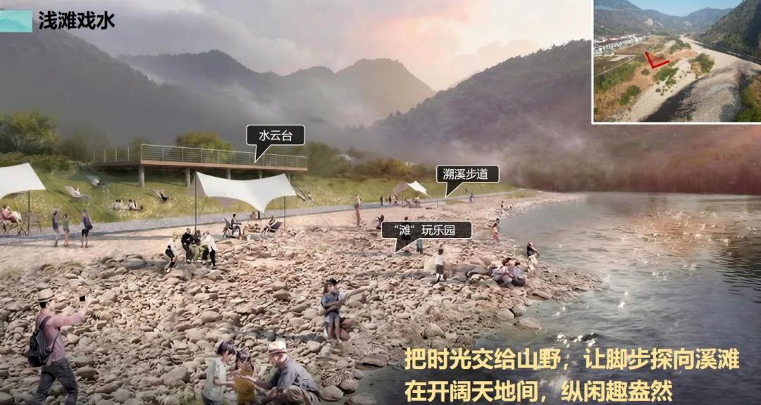 “浅滩戏水”设置戏水岩滩、下河台阶及“水云台”,打造亲子、亲水的“滩玩乐园”。