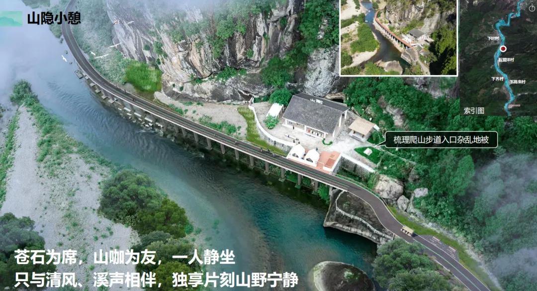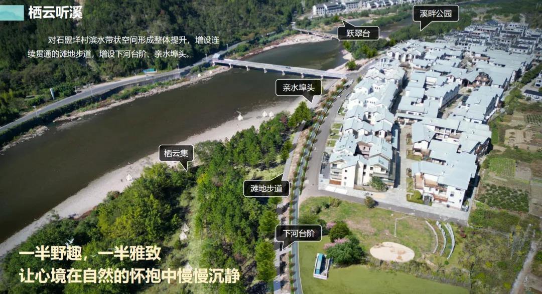 “栖云听溪”升级石盟垟村滨水景观带,建设“跃翠台”观景平台与中式景观半廊,后续可常态化举办“栖云集”等文旅活动。
